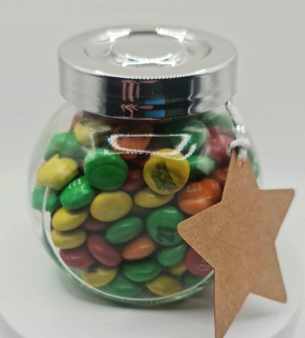 150g of genuine chocolate M&Ms presented in a glass jar with star gift label.
