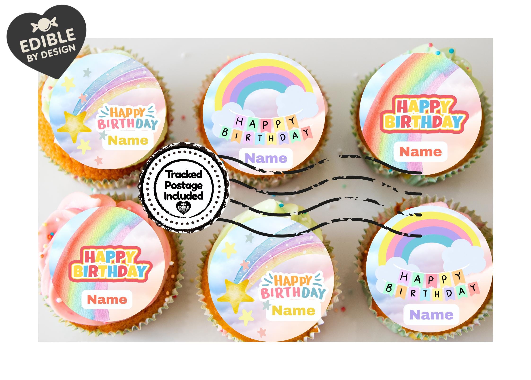 Super Cute Rainbow Theme Cake Toppers. Features your choice of name and age.
