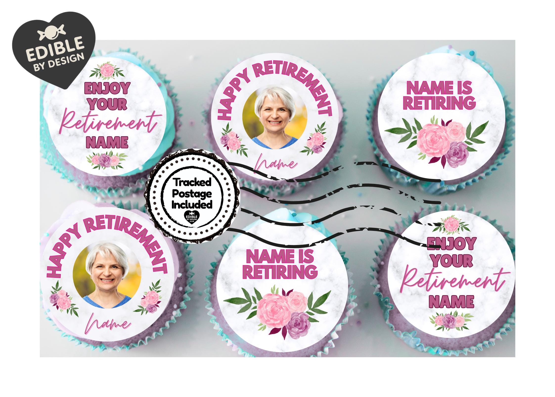 Precut Personalised Cake Toppers with edible ink. Suitable for retirement. Features your choice of photo and name. Matching 23" Foil Balloon available.