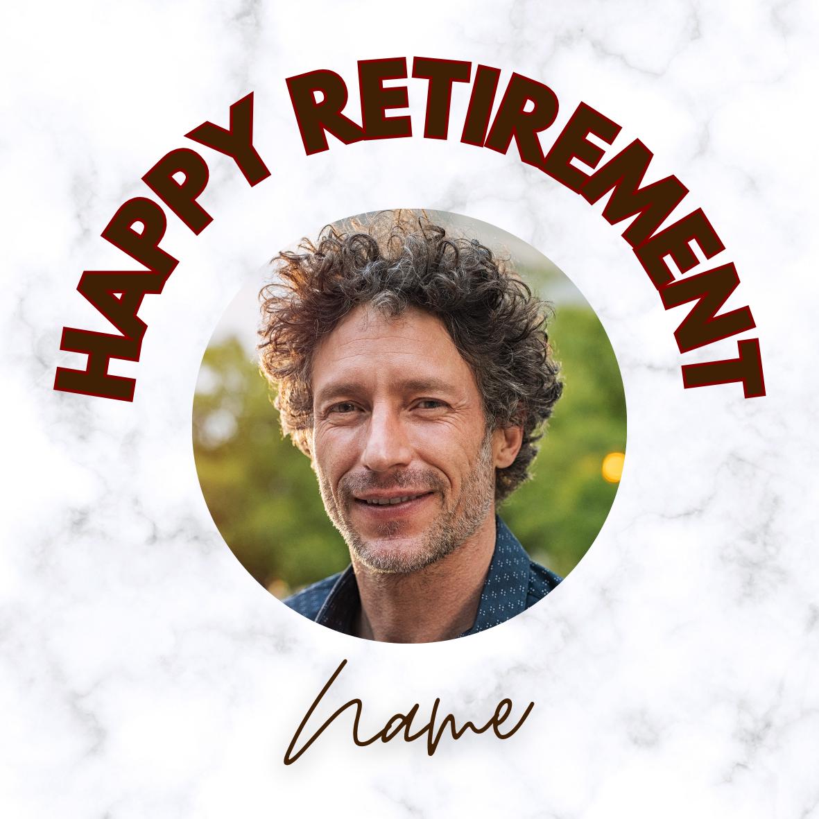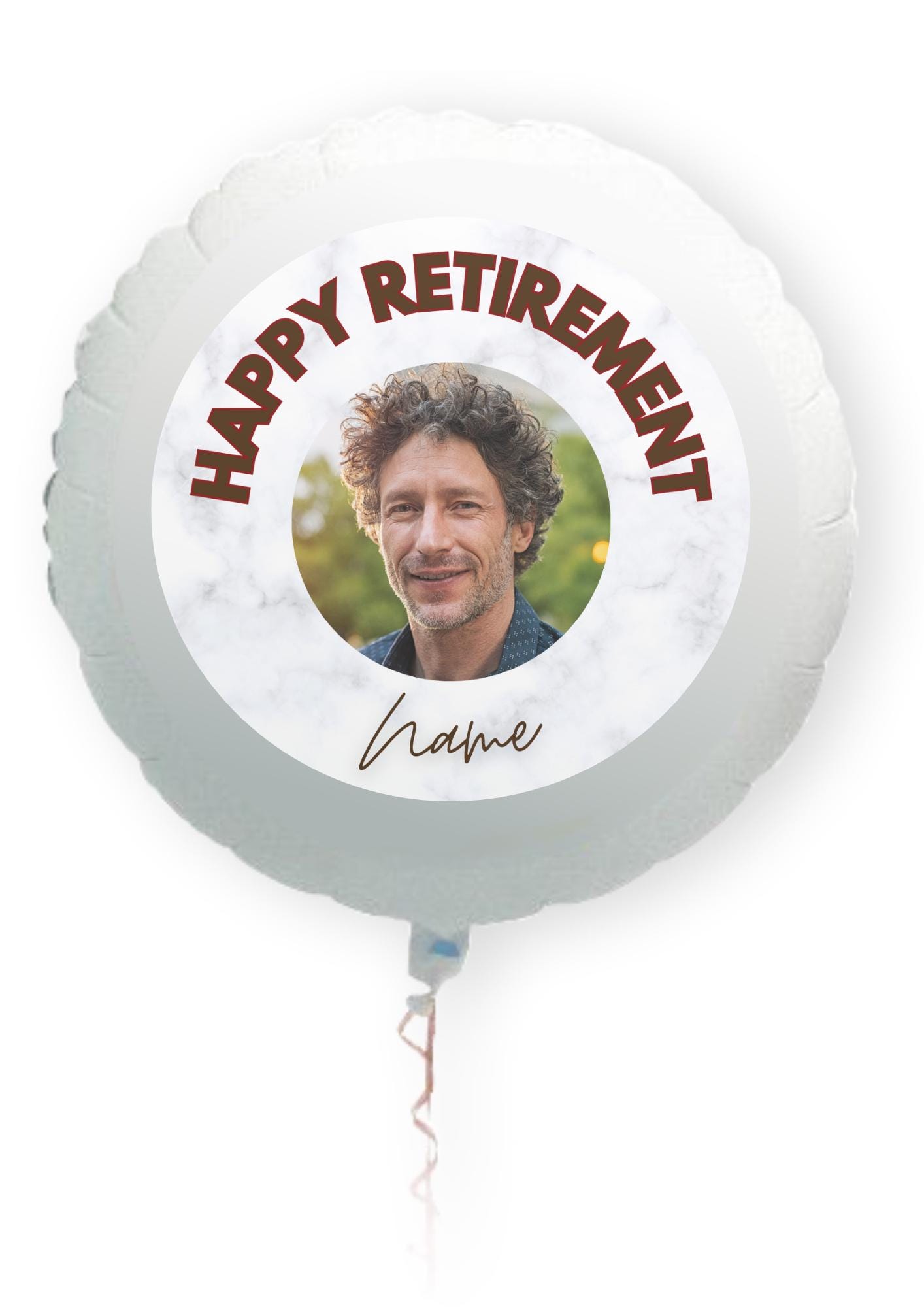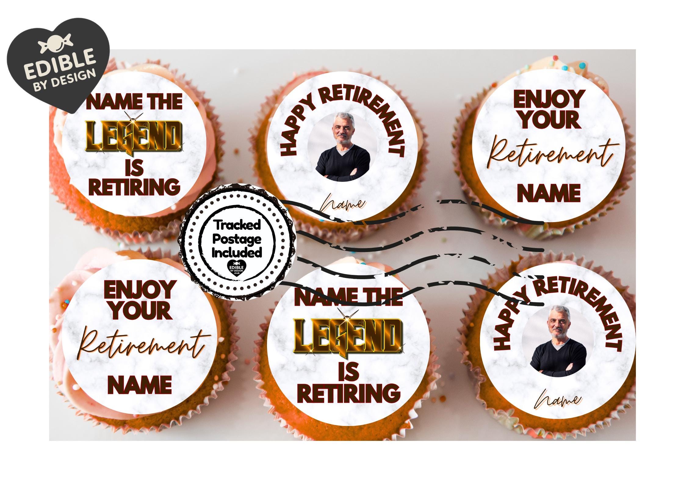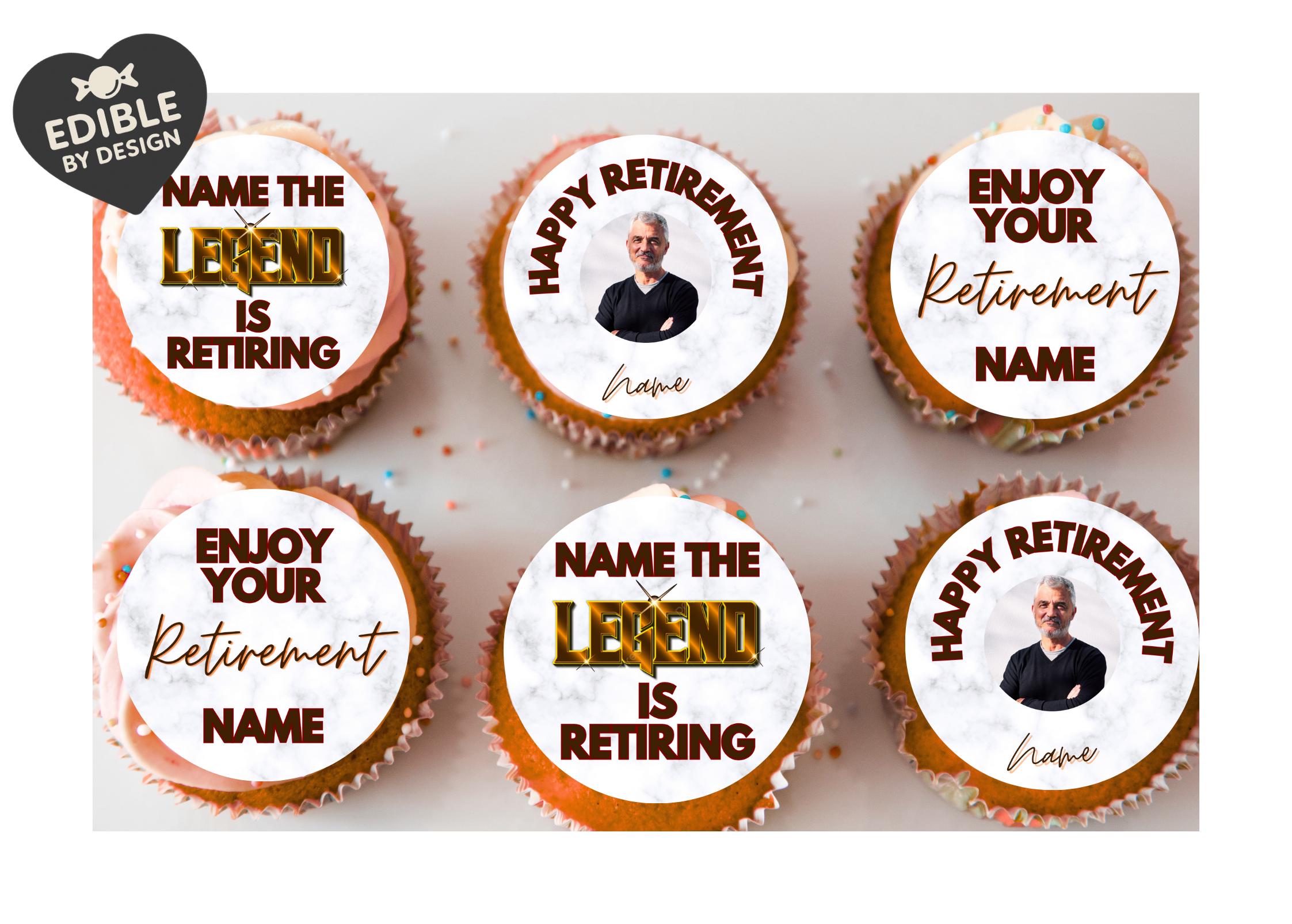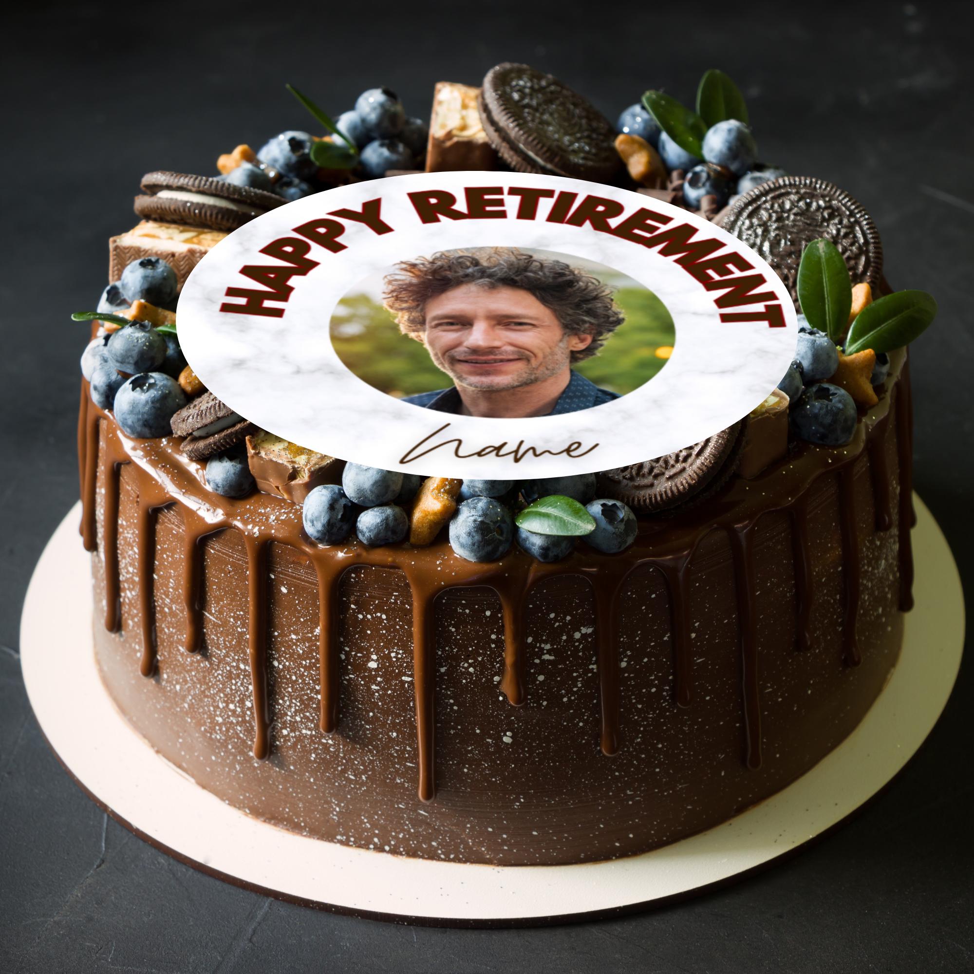 Precut Personalised Cake Toppers with edible ink. Suitable for retirement. Features your choice of photo and name. Matching Foil Balloon available.