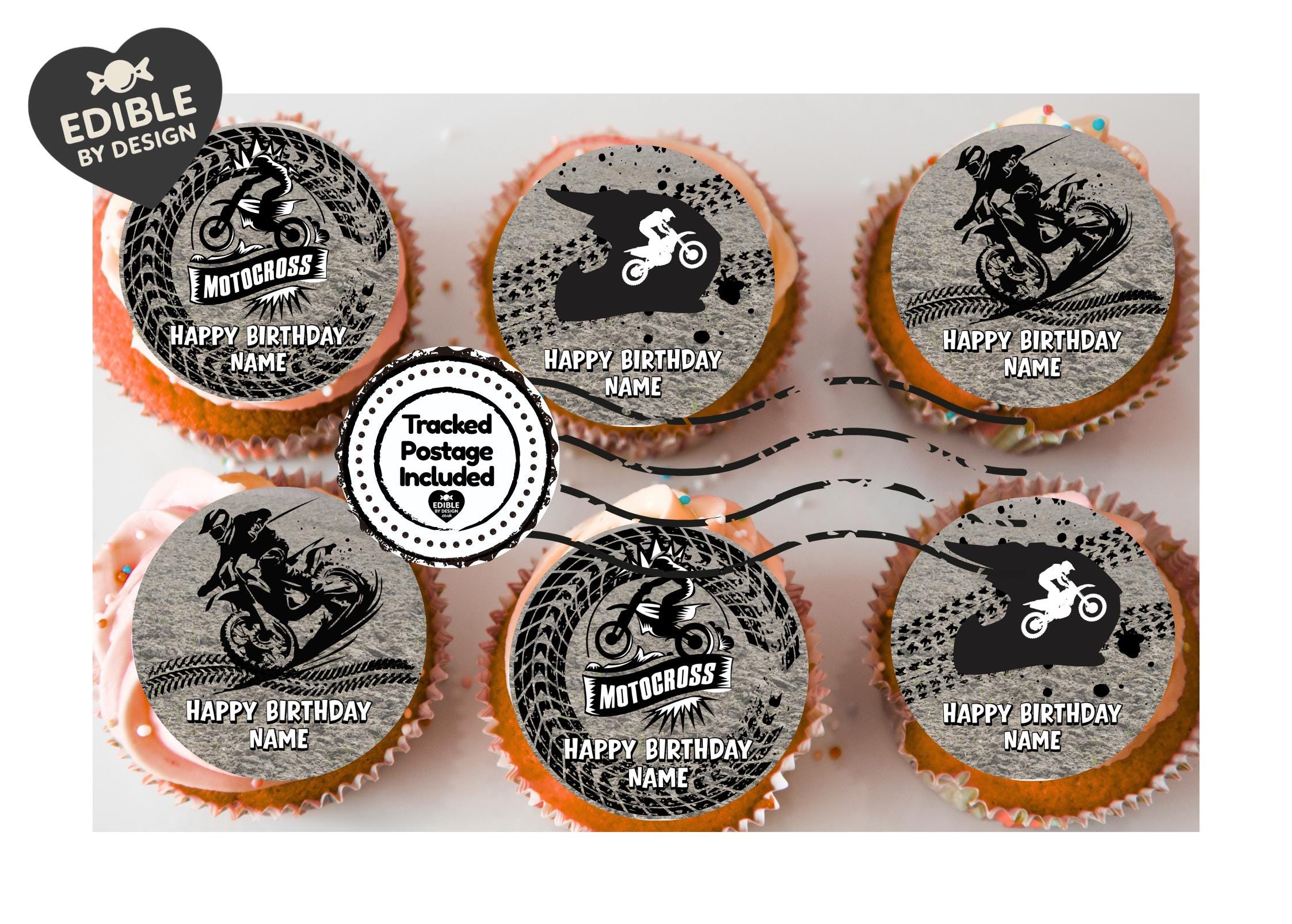 Precut Cake Toppers with edible ink. Dirt Bike Motocross theme Cake Toppers. Also available matching Invitations, Stickers, Foil Balloon and complete party pack.