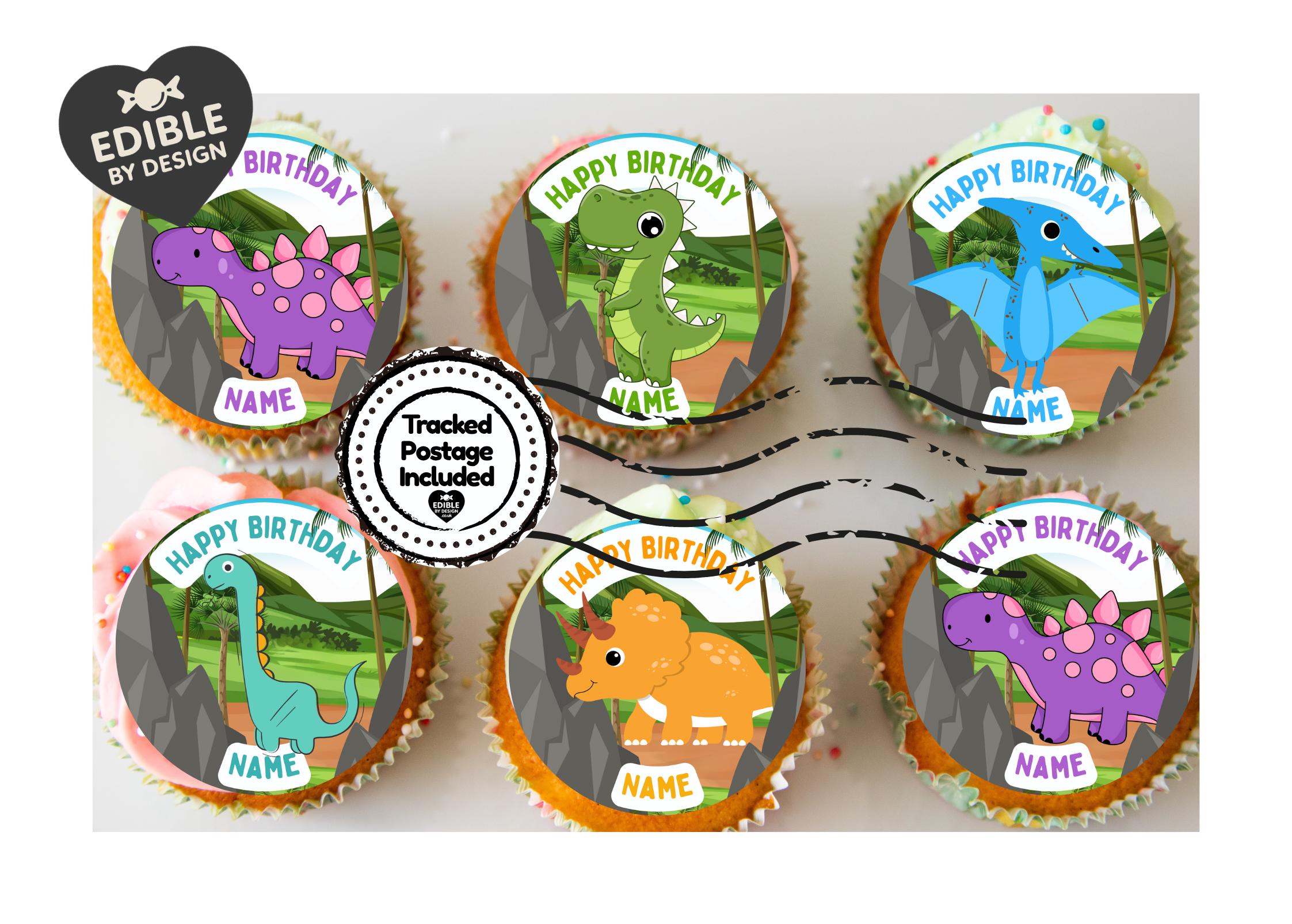 Precut Cake Toppers with edible ink. Cartoon Dinosaur theme toppers, matching Invitations Stickers Balloon Party Pack.