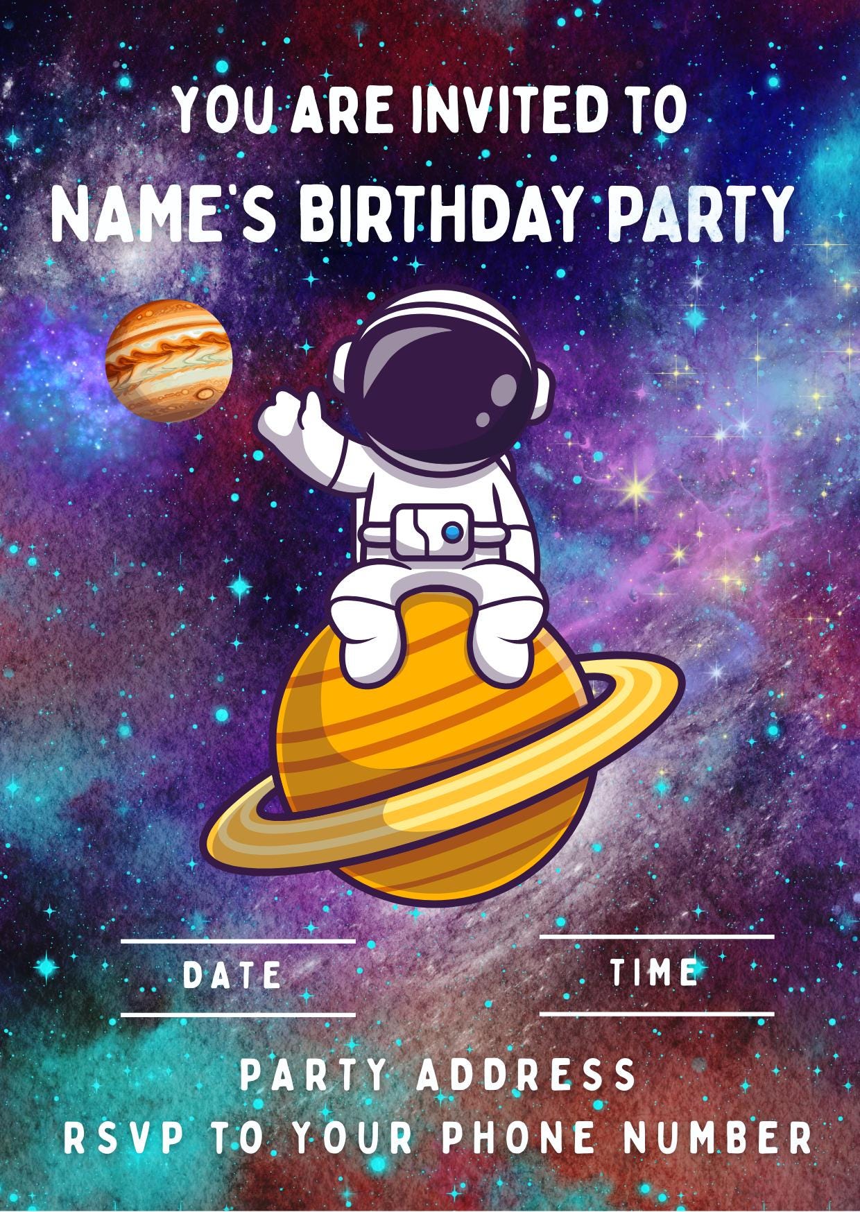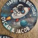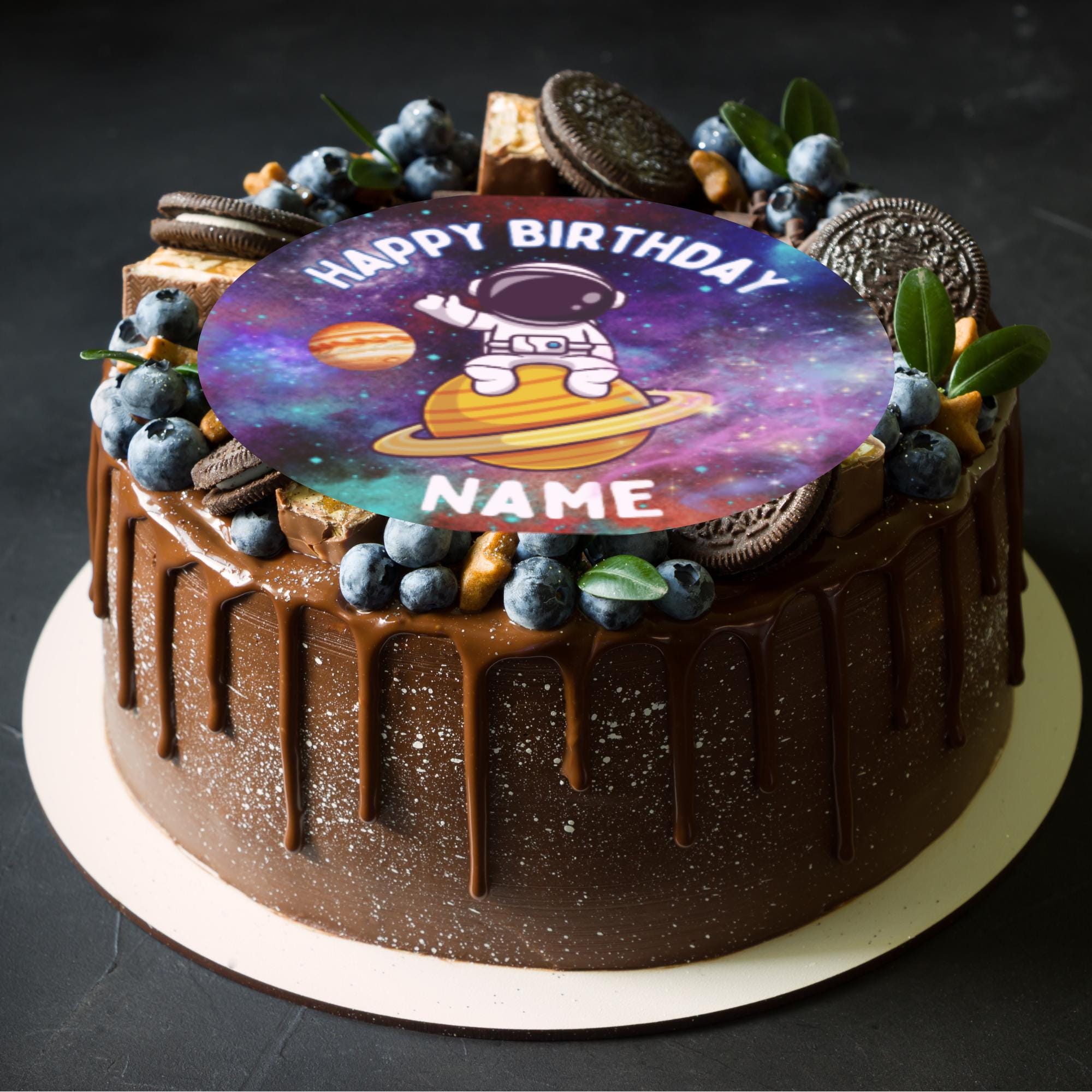 Space Astronaut Theme Cake Toppers. Features Astronaut with Planets, Stars, Rockets etc in space scenery. Personalised with your choice of name and age.
