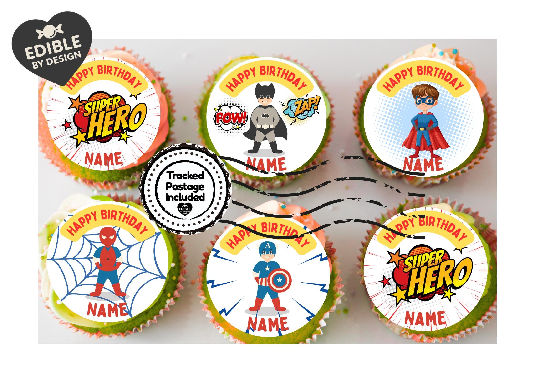 Super Hero Theme Cake Toppers. Features Superman, Batman, Captain America and Spiderman. Personalised with your choice of name and age if required.