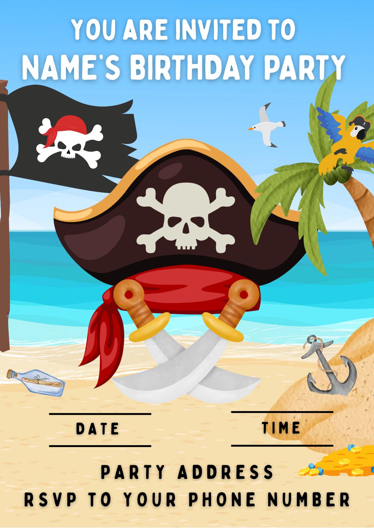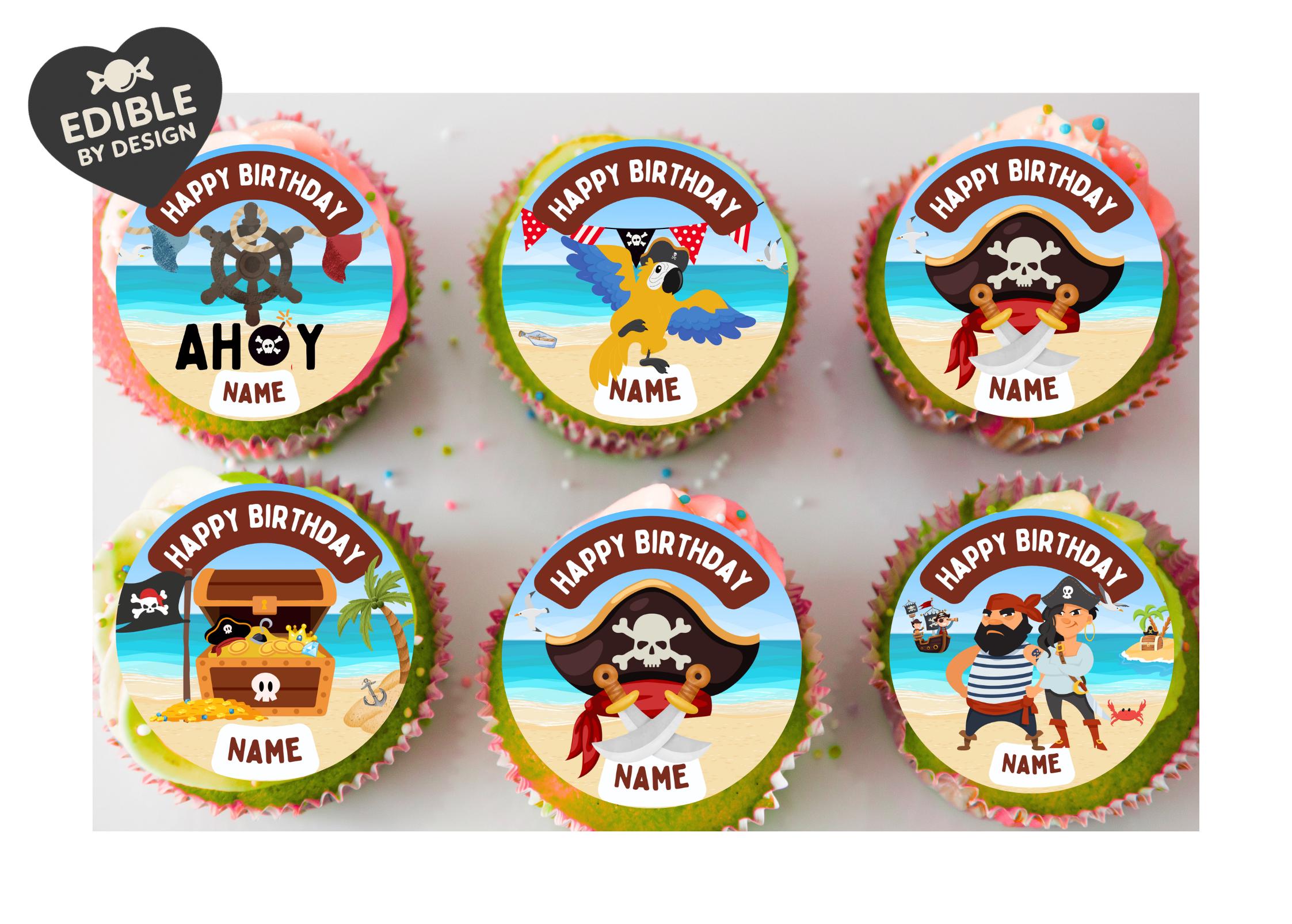 Pirate Theme Cake Toppers. Features Pirates, Parrots, Pirate Treasure, Pirate Boats etc. Personalised with your choice of name and age.