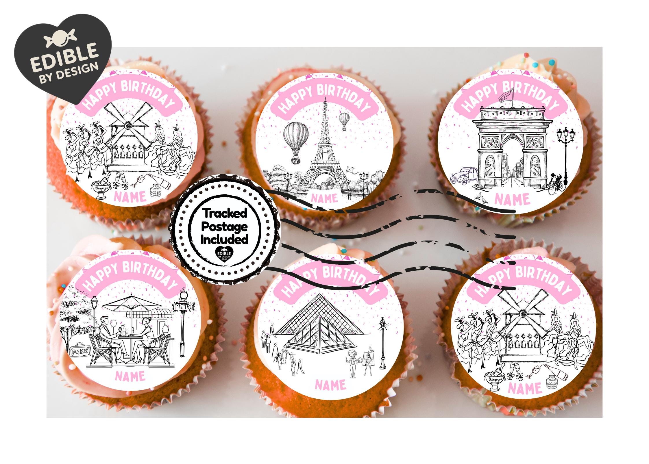 Feminine Pink Paris Birthday Party Theme Cake Toppers. Features Eiffel Tower, Hot Air Balloons, Cafés, Moulin Rouge, Cancan Dancers, Metro, The Louvre Gallery, Mona Lisa, Arc de Triomphe, Champagne and Wine. Personalised with your choice of name and age if required.