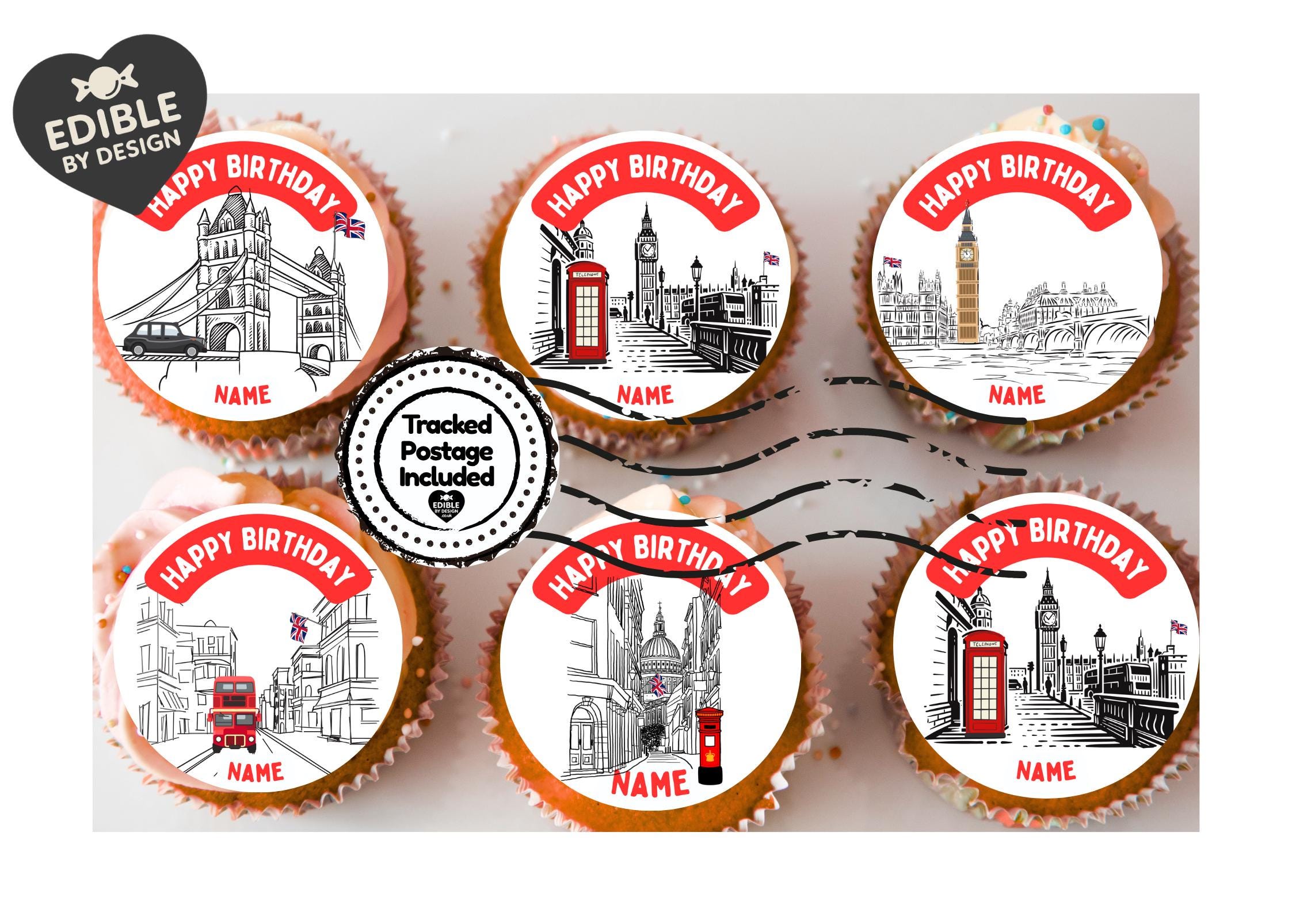 Precut Personalised Cake Toppers with edible ink. Unisex London Birthday Party Theme Cupcake Toppers. Features Tower Bridge, London Cab, Westminster Palace, Big Ben, Telephone Box, Post Box, London Bus, Tower of London and St Pauls. Personalised with your choice of name and age. Matching 23" Foil Balloon available.
