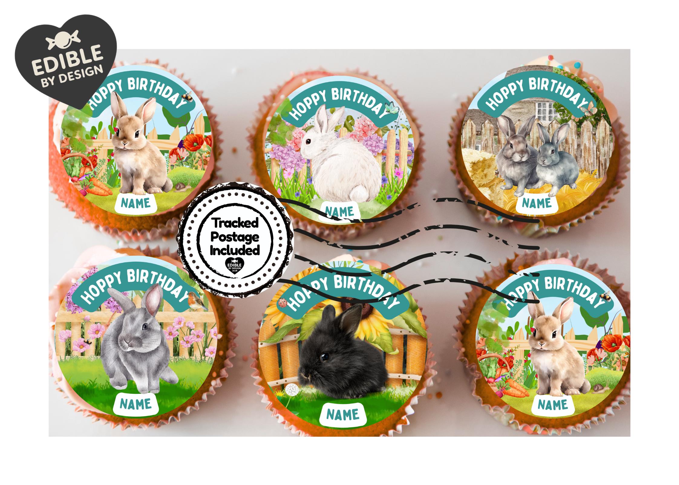 Precut Personalised Cupcake Toppers with edible ink. Bunny Rabbit Birthday Party Theme Cupcake Toppers. Features cute rabbits in garden settings. Personalised with your choice of name and age. Also available matching Invitations, Stickers, Foil Balloon and complete party pack.