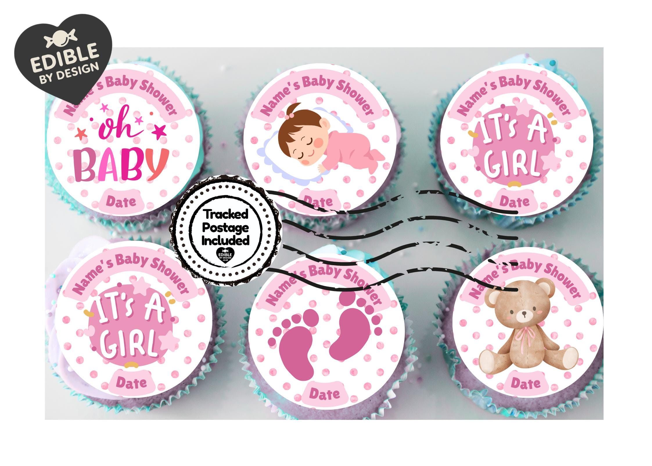 Precut Personalised Cake Toppers with edible ink. Baby Shower Party Cake Toppers in gorgeous pink tones. Features Sleeping Baby, Teddy Bear, Baby Feet etc. Matching Foil Balloon and Stickers available.
