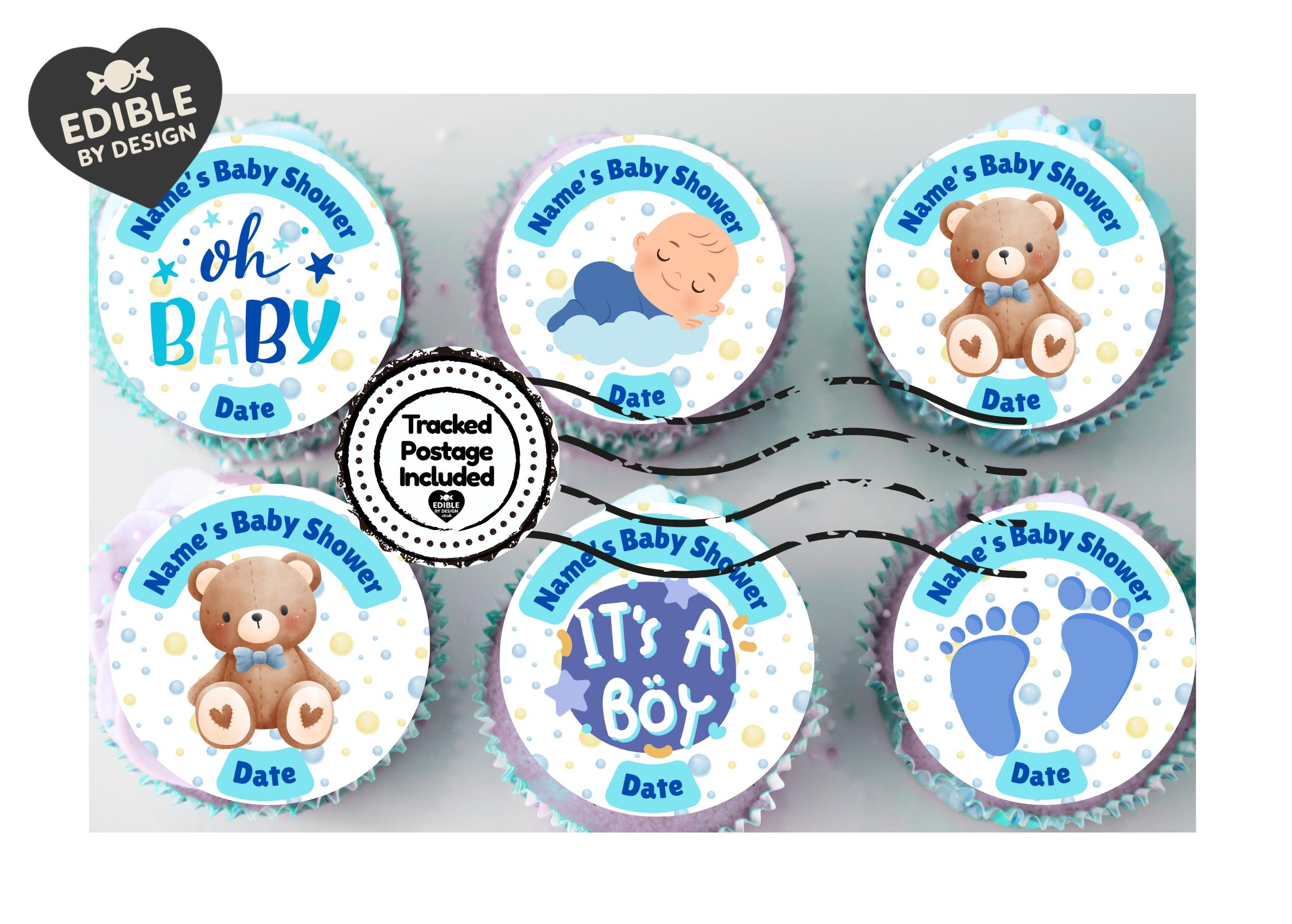 Precut Personalised Cupcake Toppers with edible ink. Baby Shower Party Cupcake Toppers in gorgeous blue tones. Features Sleeping Baby, Teddy Bear, Baby Feet etc. Matching Stickers and Foil Balloon available.