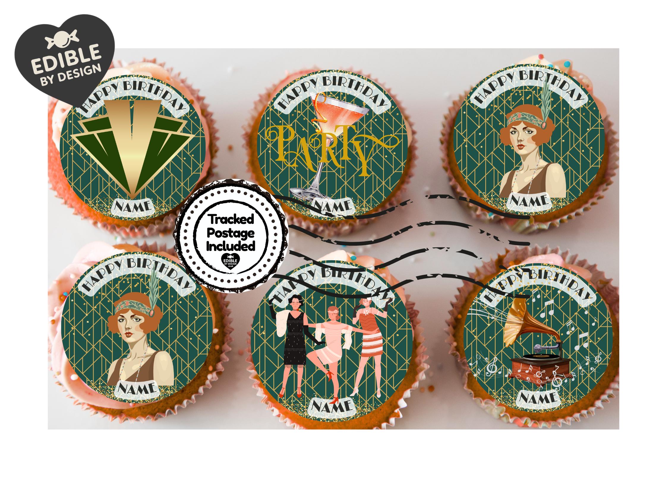 Precut The Great Gatsby 1920's theme Cake Toppers. Featuring Art Deco, Flapper Girls, Gramophone, Cocktail etc. Also available matching Invitations, Stickers, Foil Balloon and complete party pack.