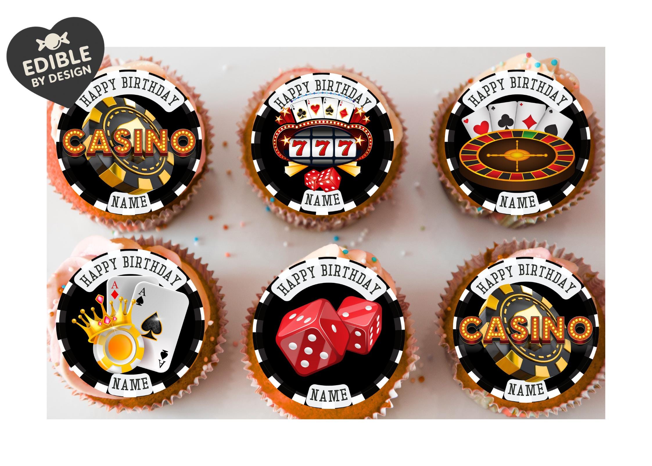 Precut Birthday Cake Toppers with edible ink. Casino theme featuring Dice, Cards, Chips, Wheel etc. Also available matching Invitations, Stickers, Foil Balloon and complete party pack.