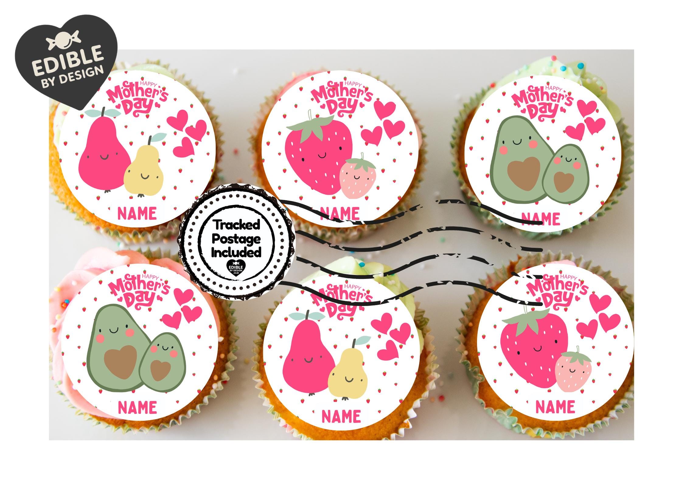 Super cute Mum and Baby Fruit theme Cake Toppers with edible ink. These include your choice of name.