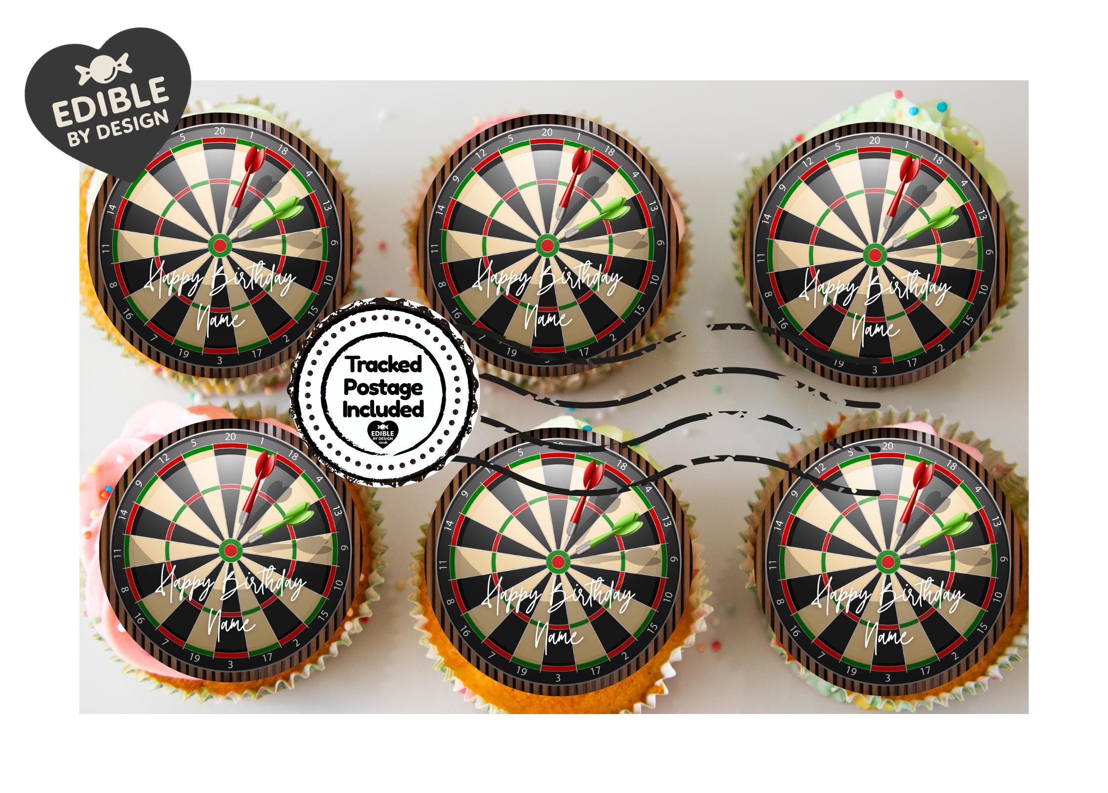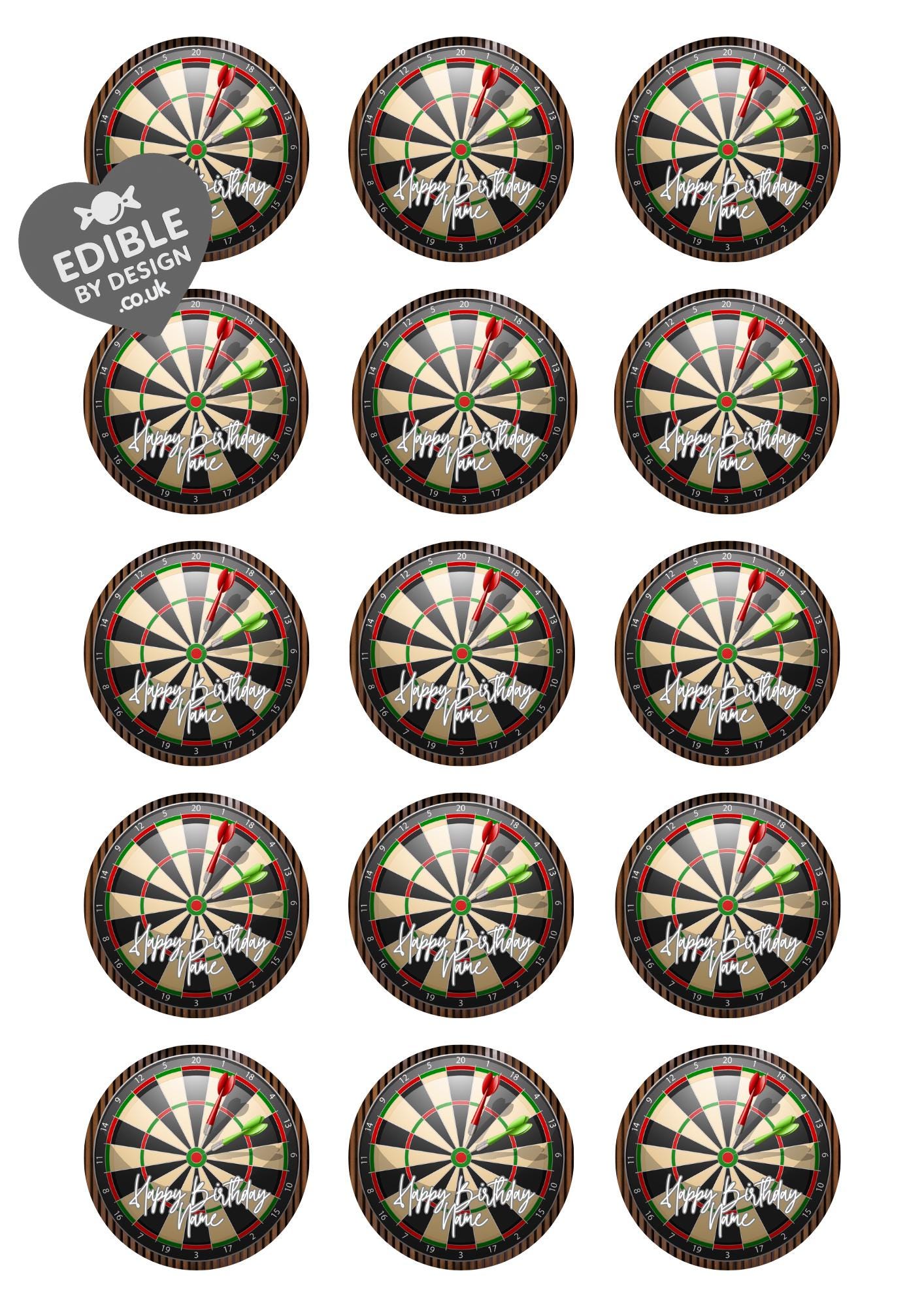 Precut Party Cake Toppers with edible ink. Darts Board theme Cake Toppers. These toppers are personalised as required. Also available as Stickers - 15 and a 23" Foil Balloon.