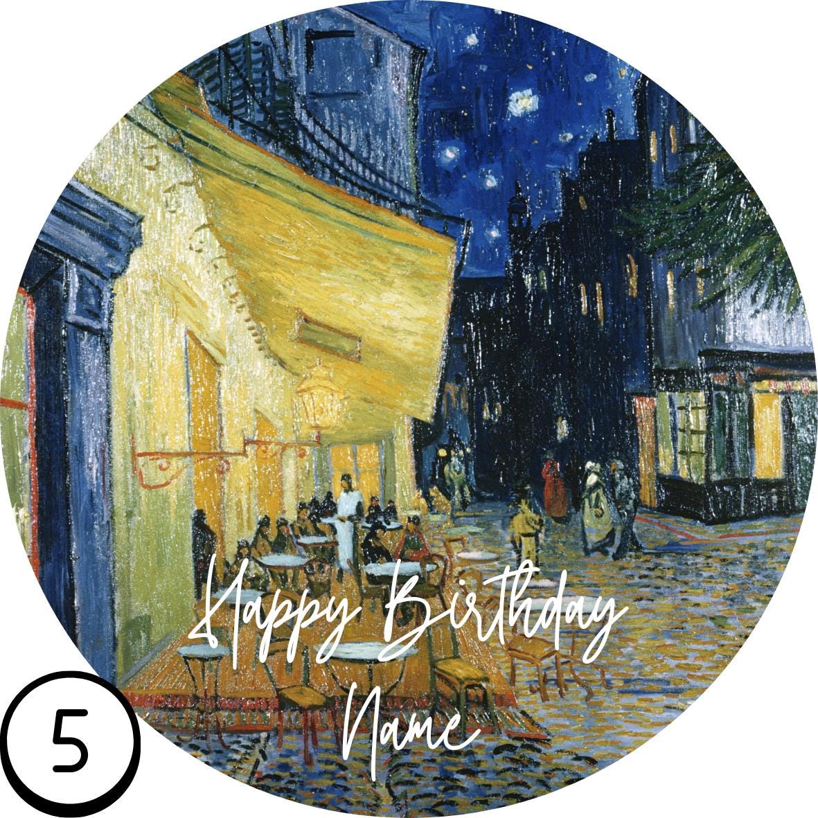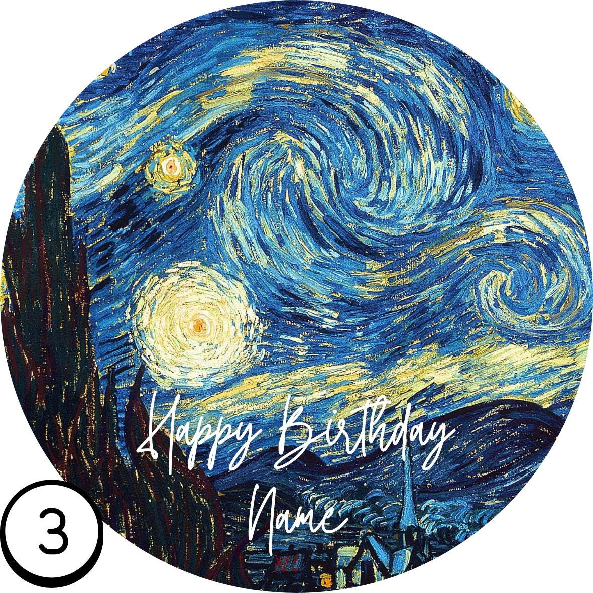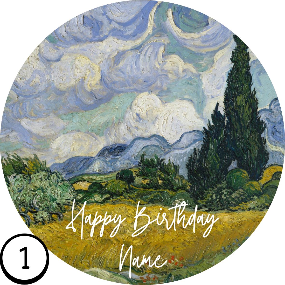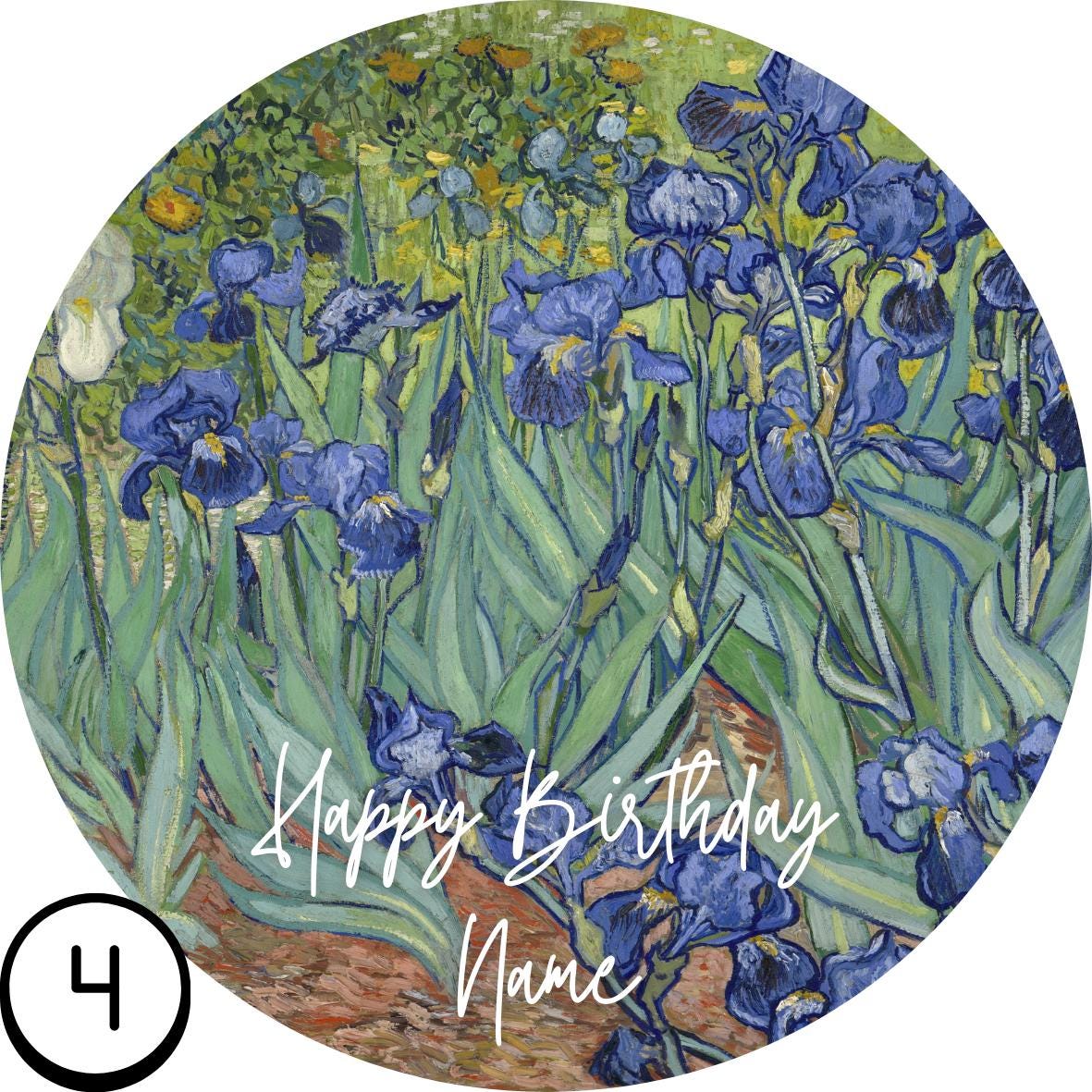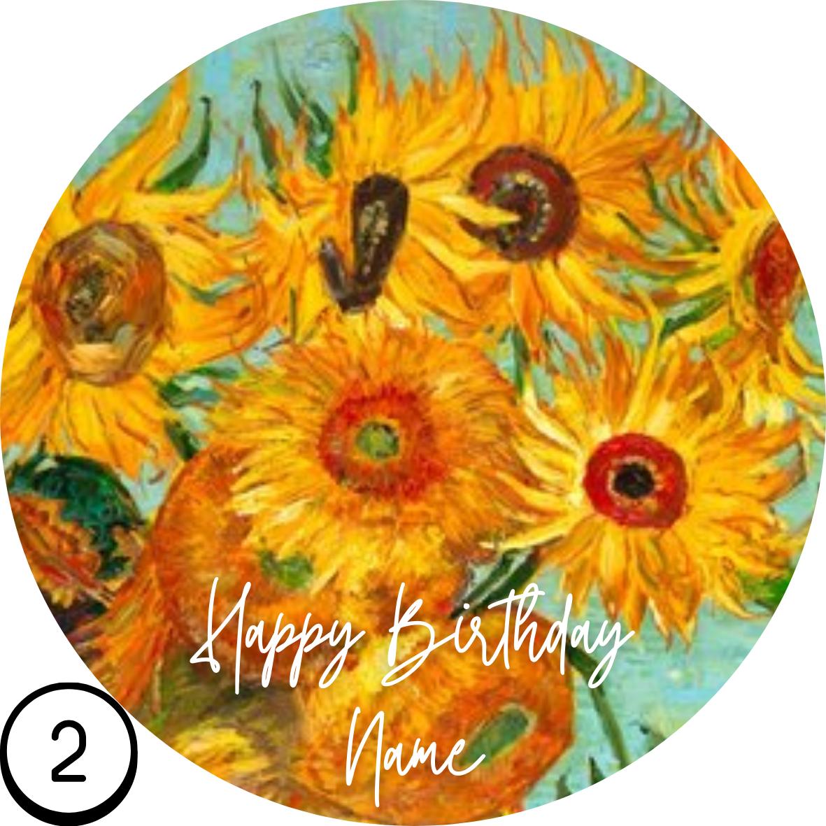 Precut Van Gogh Theme Cake Topper Starry Night, Sunflowers, Iris's etc. Personalised with your choice of design and name.