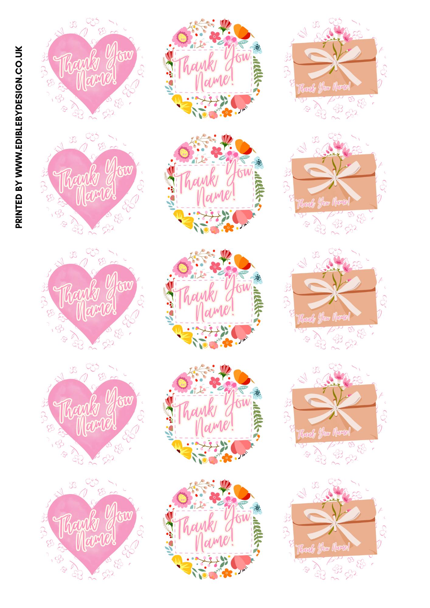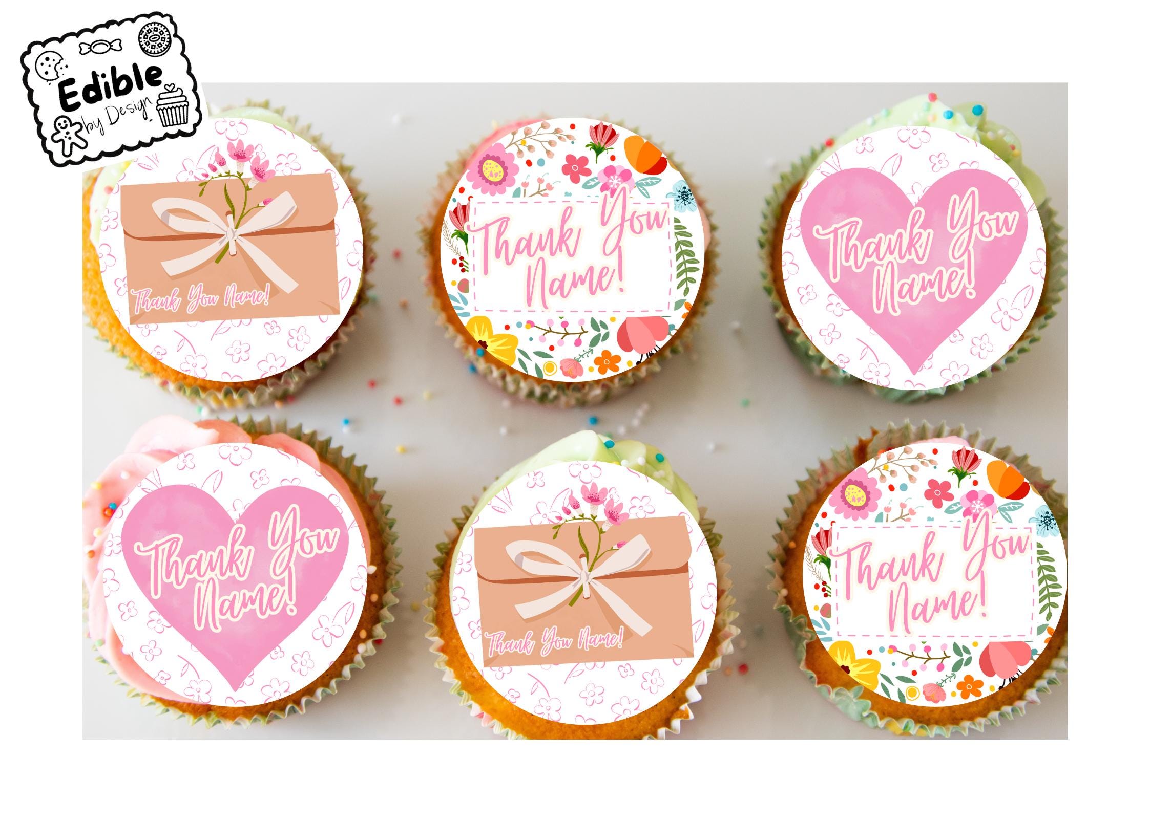 Thank You Personalised Cupcake Toppers: Floral Design Edible Image Circles on Icing or Wafer