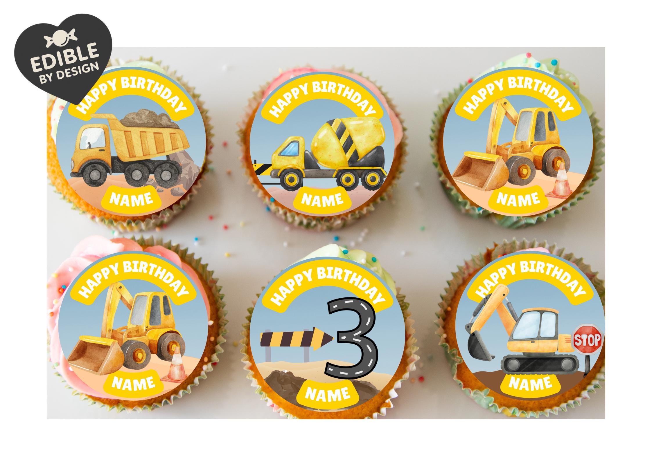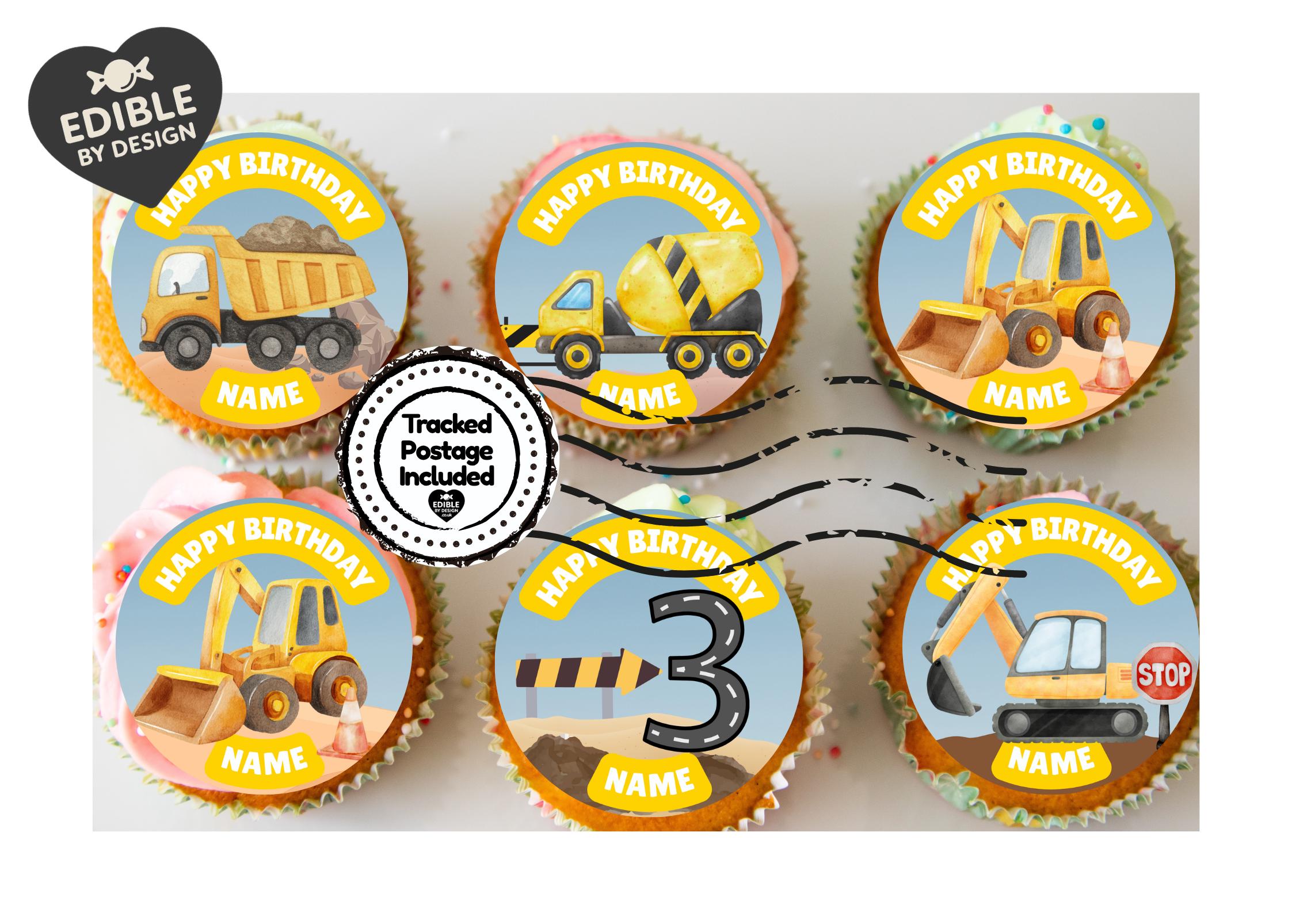Construction Site Digger Theme Cupcake Toppers. Features Diggers, Tractor, Mixer etc. Personalised with your choice of name and age.