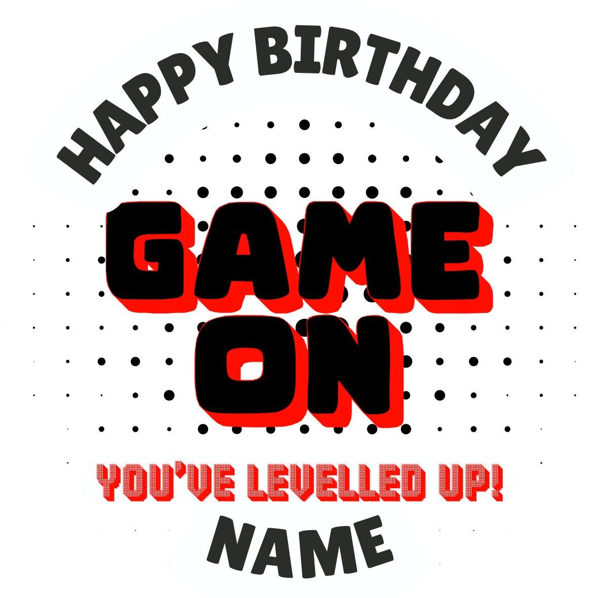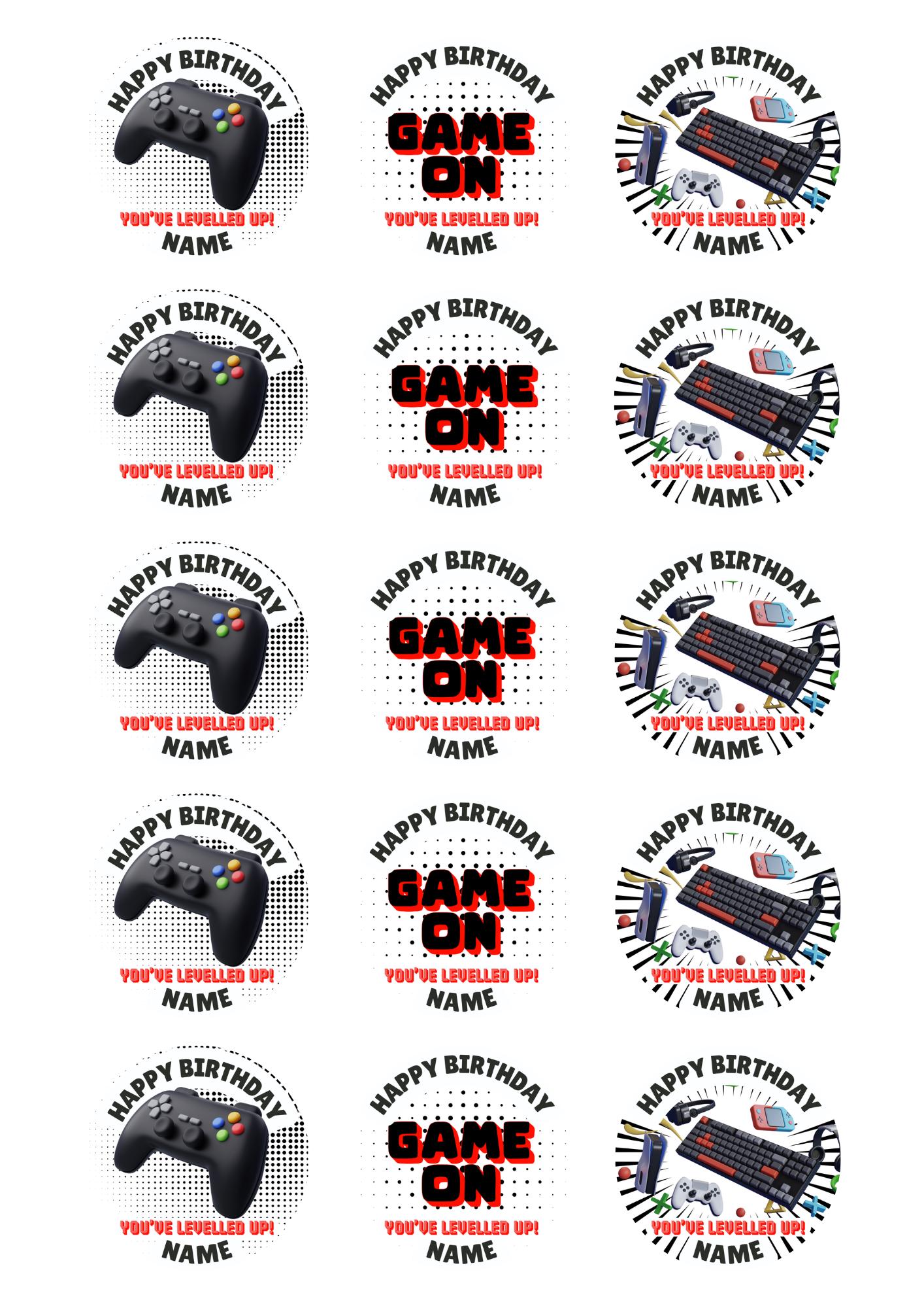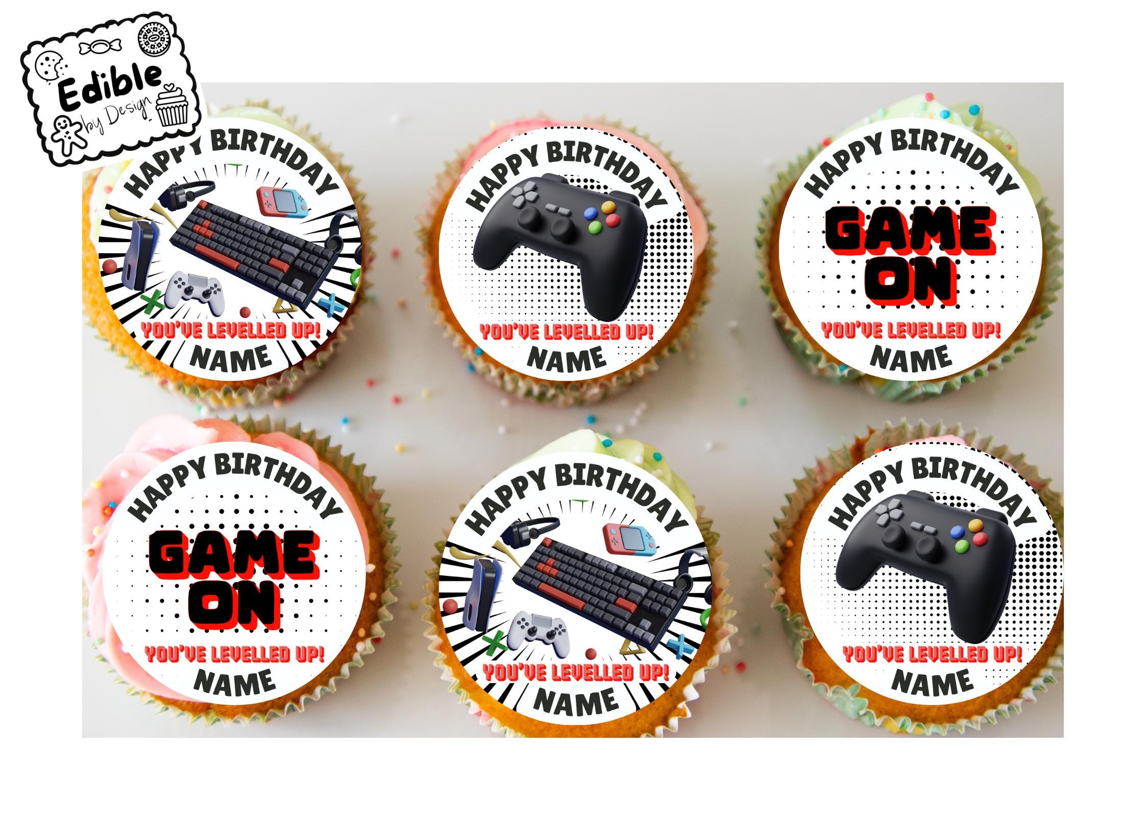 Gaming Theme Cupcake Toppers. Features Game On text, Controller and gaming equipment etc. Personalised with your choice of name and age.