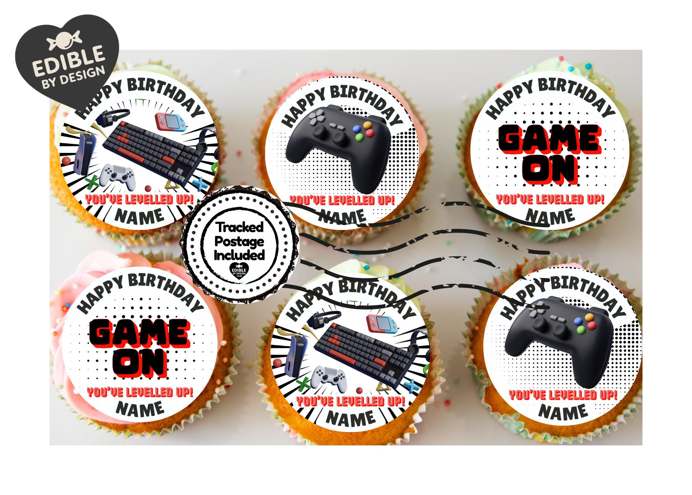 Gaming Theme Cake Toppers. Features Game On text, Controller and gaming equipment etc. Personalised with your choice of name and age.