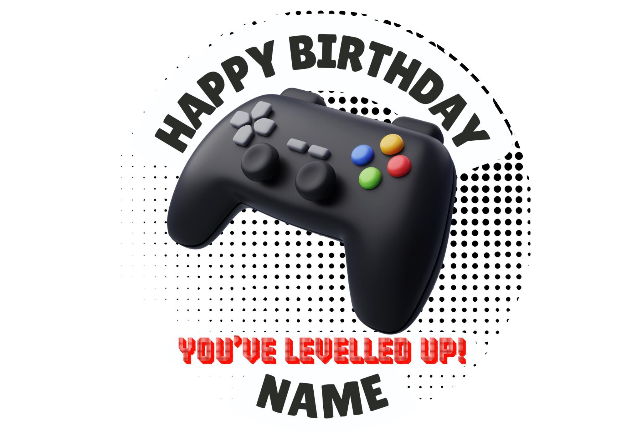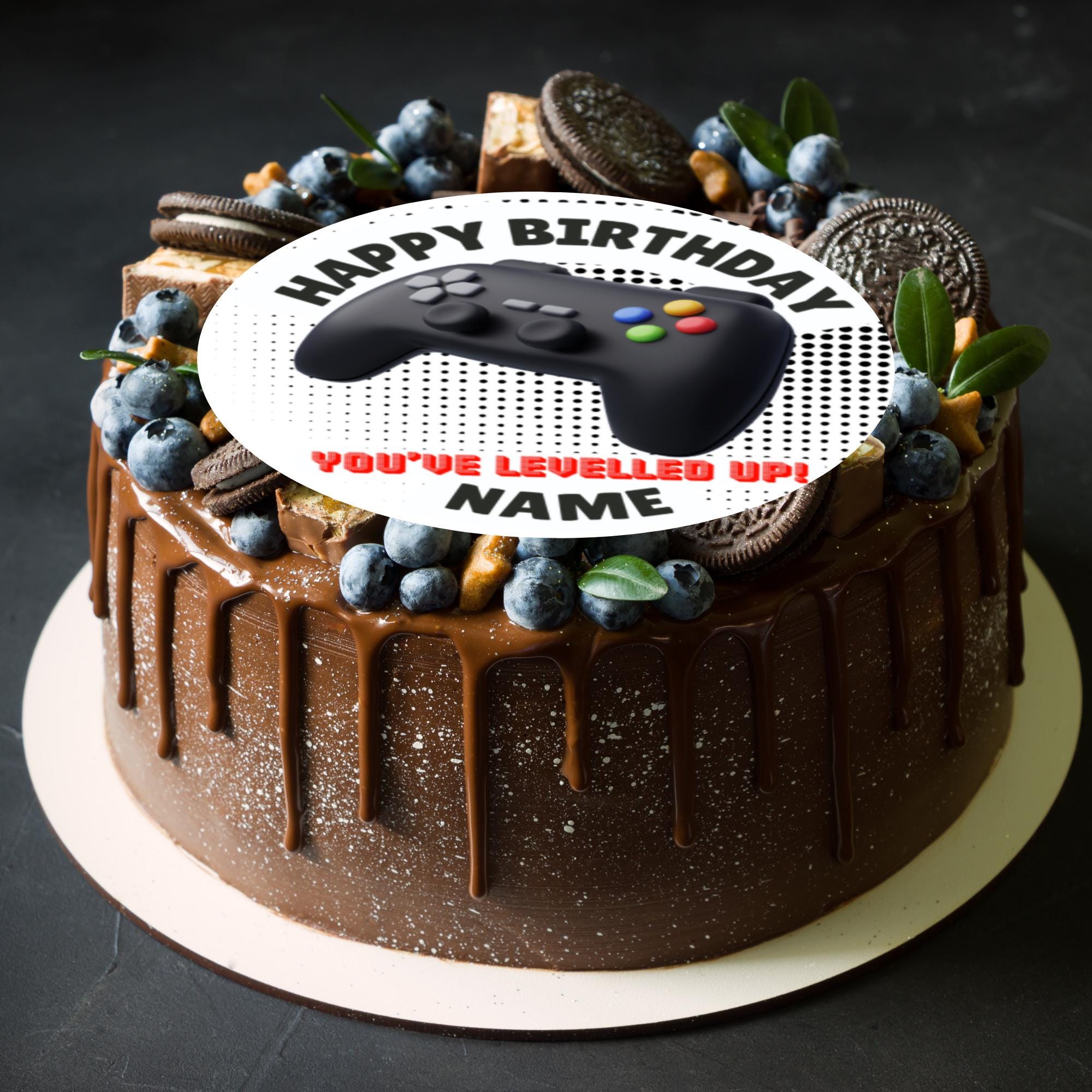 Gaming Theme Cake Topper/s. Features Game On text, Controller and gaming equipment etc. Personalised with your choice of design, name and age.