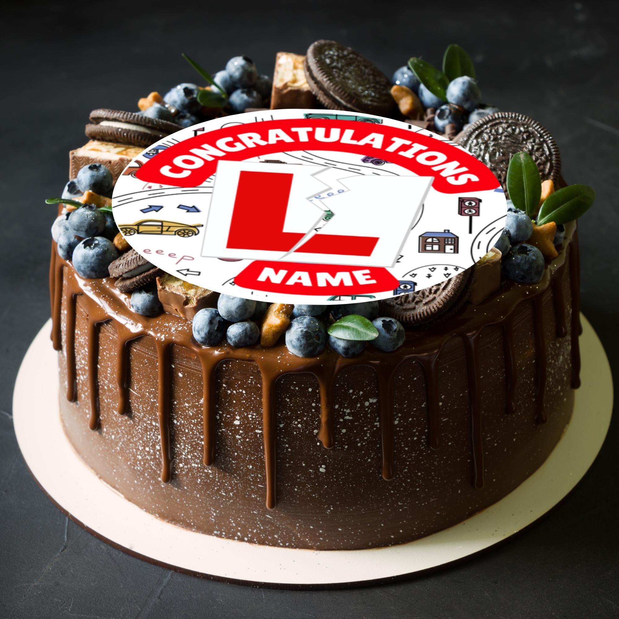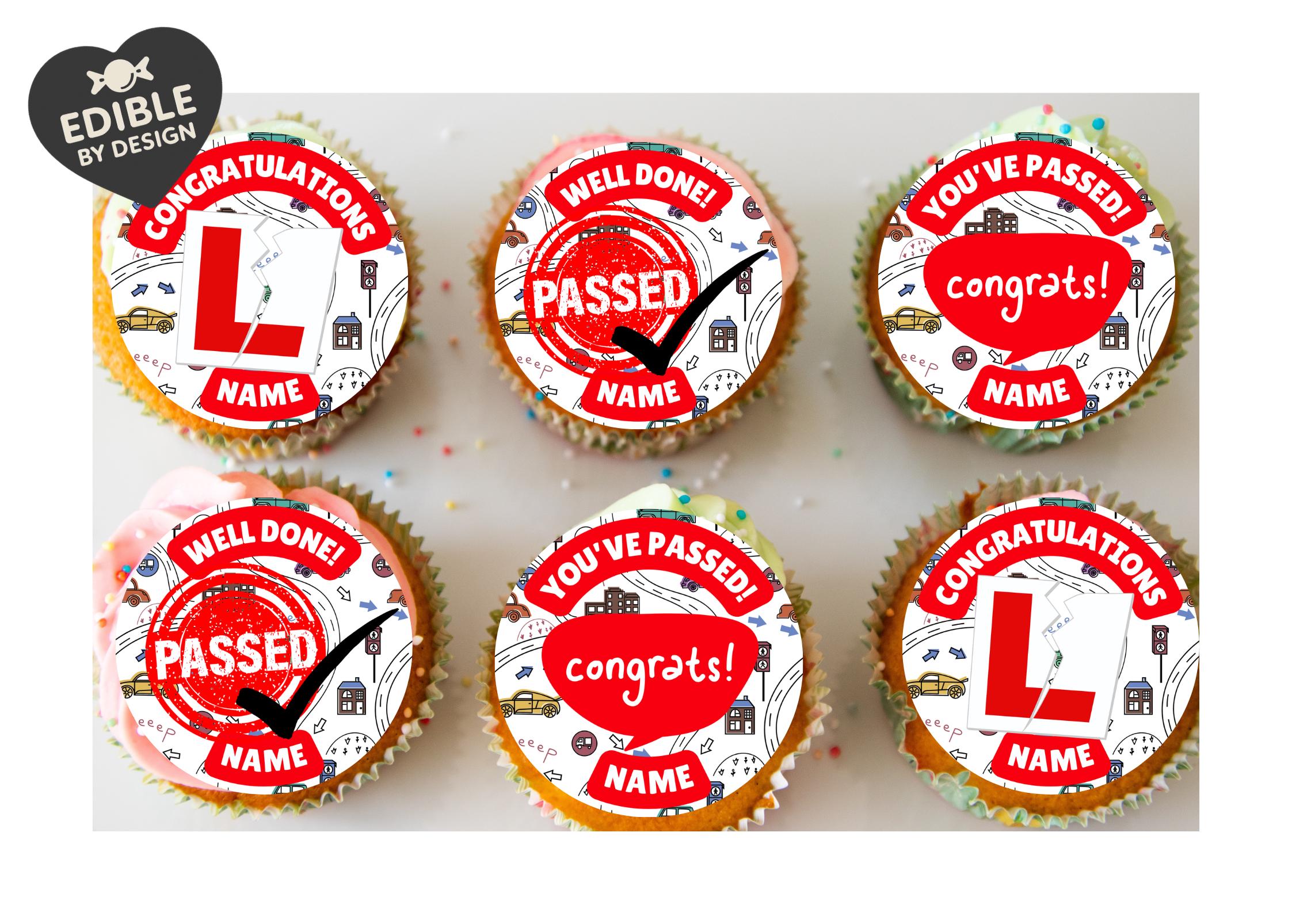 Precut Driving Test Pass Cupcake Toppers with edible ink. These toppers are personalised with a name. Matching Foil Balloon available.