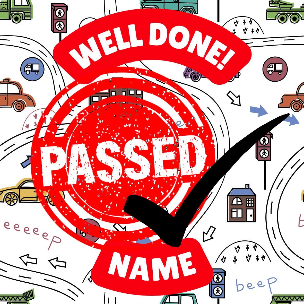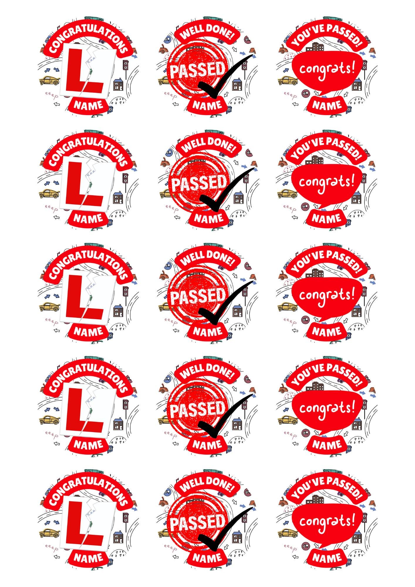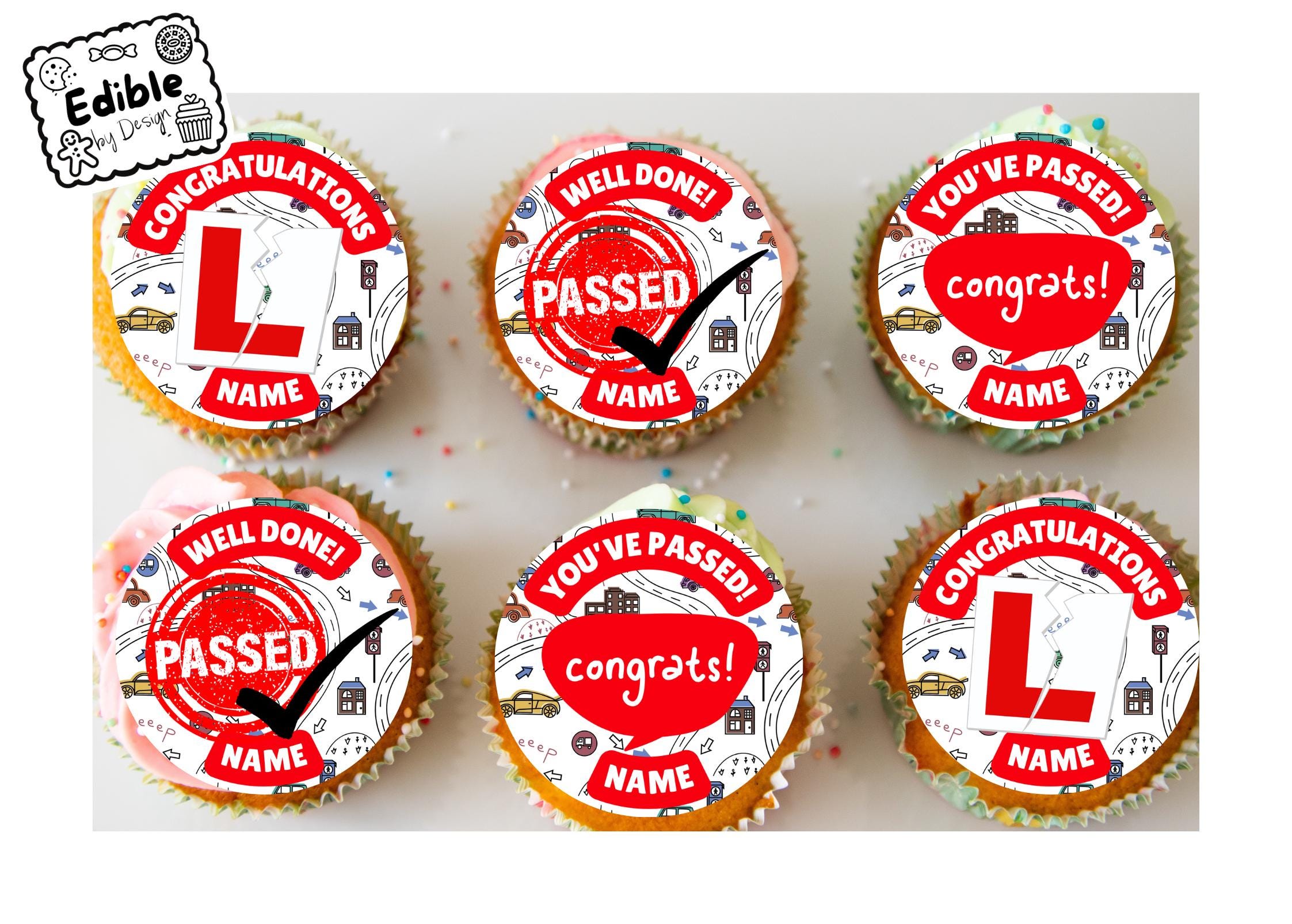Precut Driving Test Pass Cupcake Toppers with edible ink. These toppers are personalised with a name.