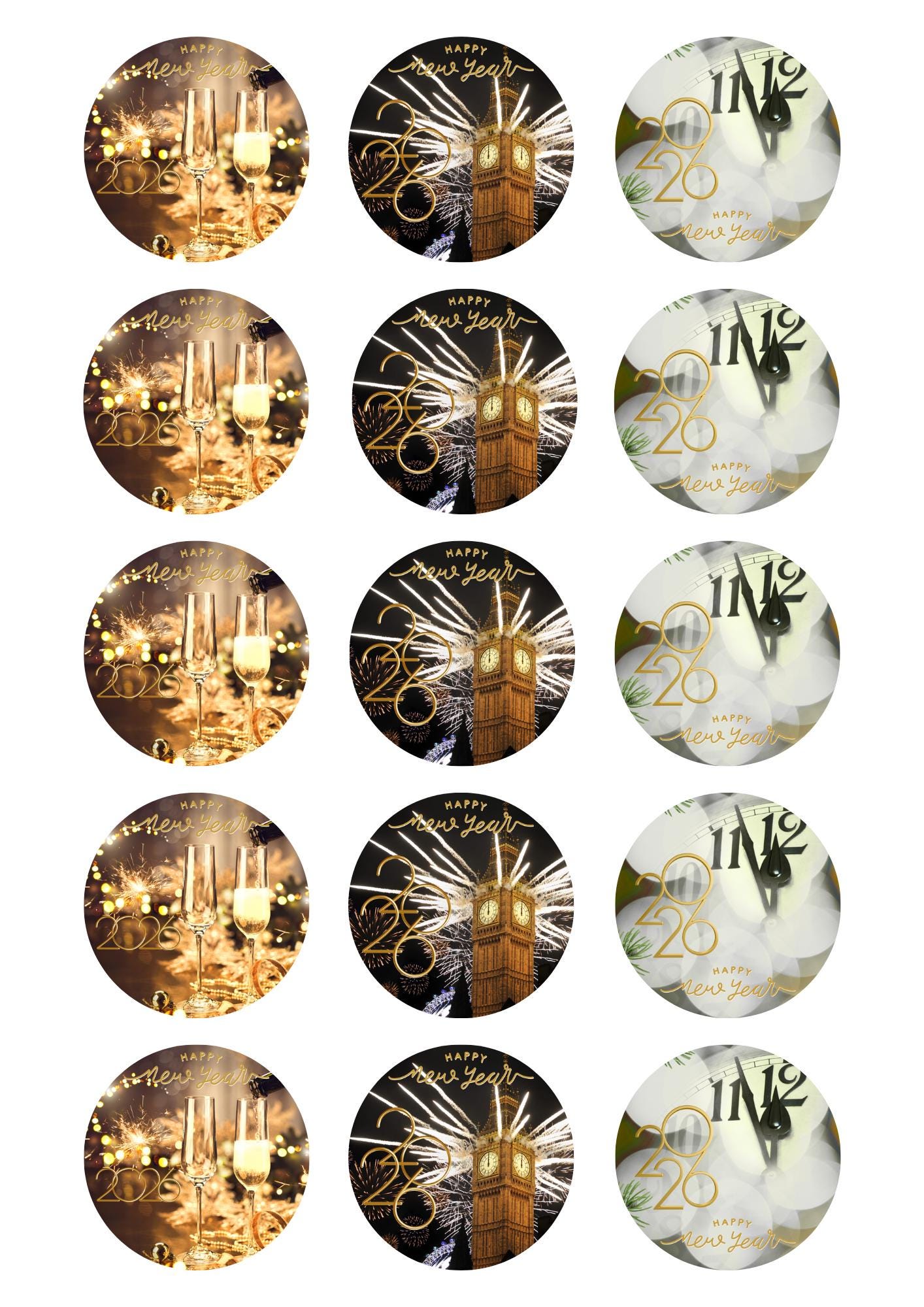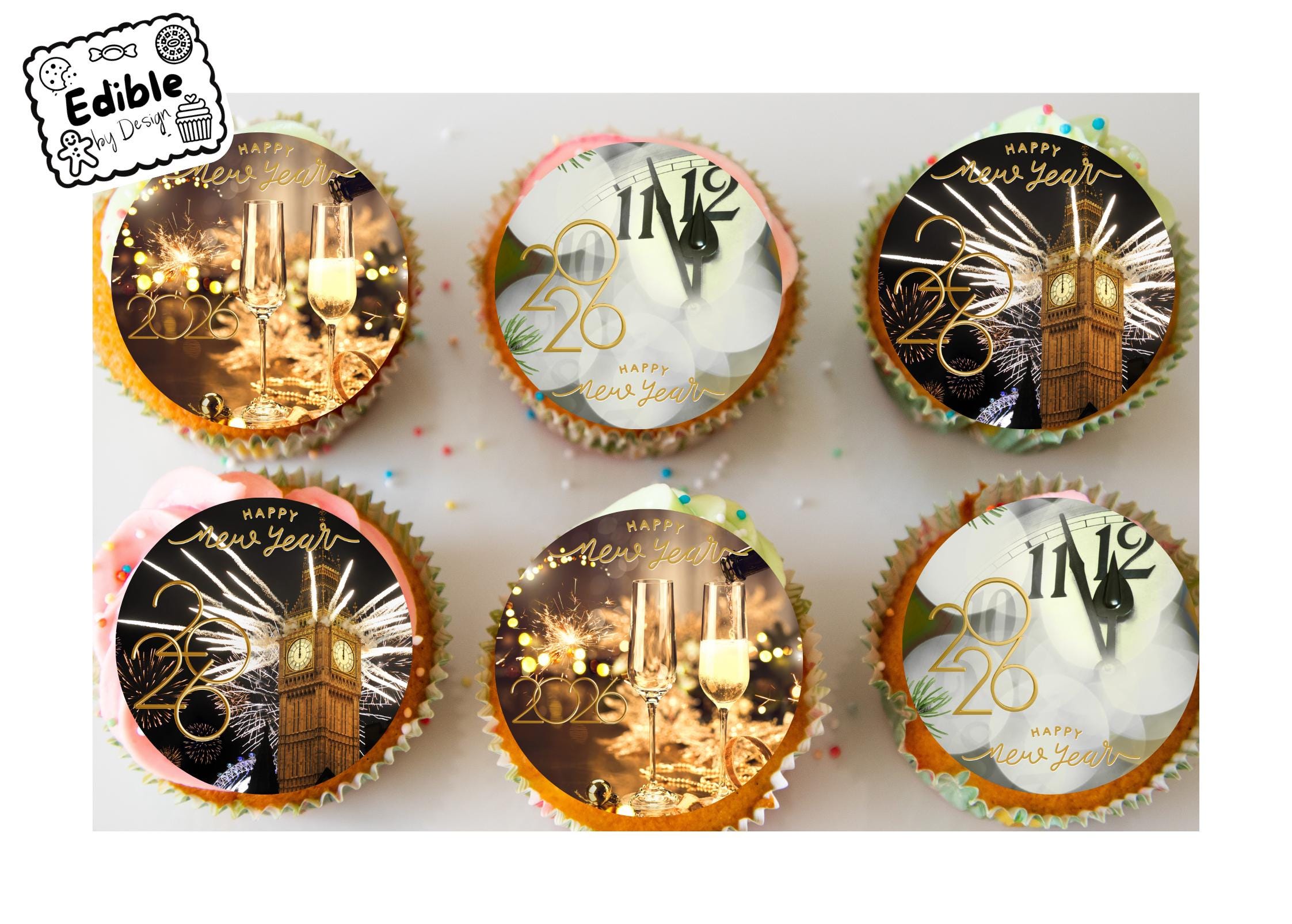 Precut Cupcake Toppers with edible ink. 2026 Happy New Year Cupcakes Toppers - additional names or text can be added.