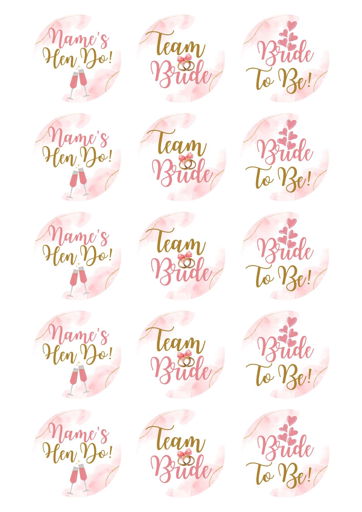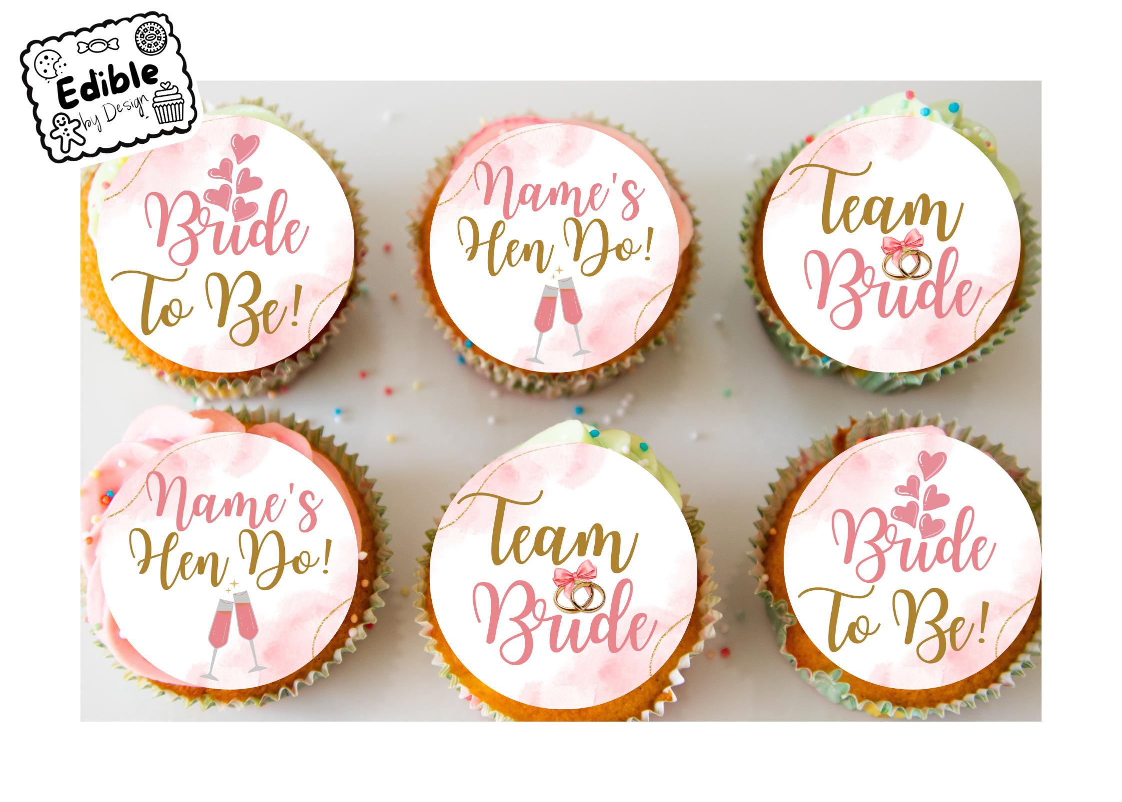 Precut Bride To Be, Hen Do Party Cupcake Toppers with edible ink. These toppers are personalised with a name.