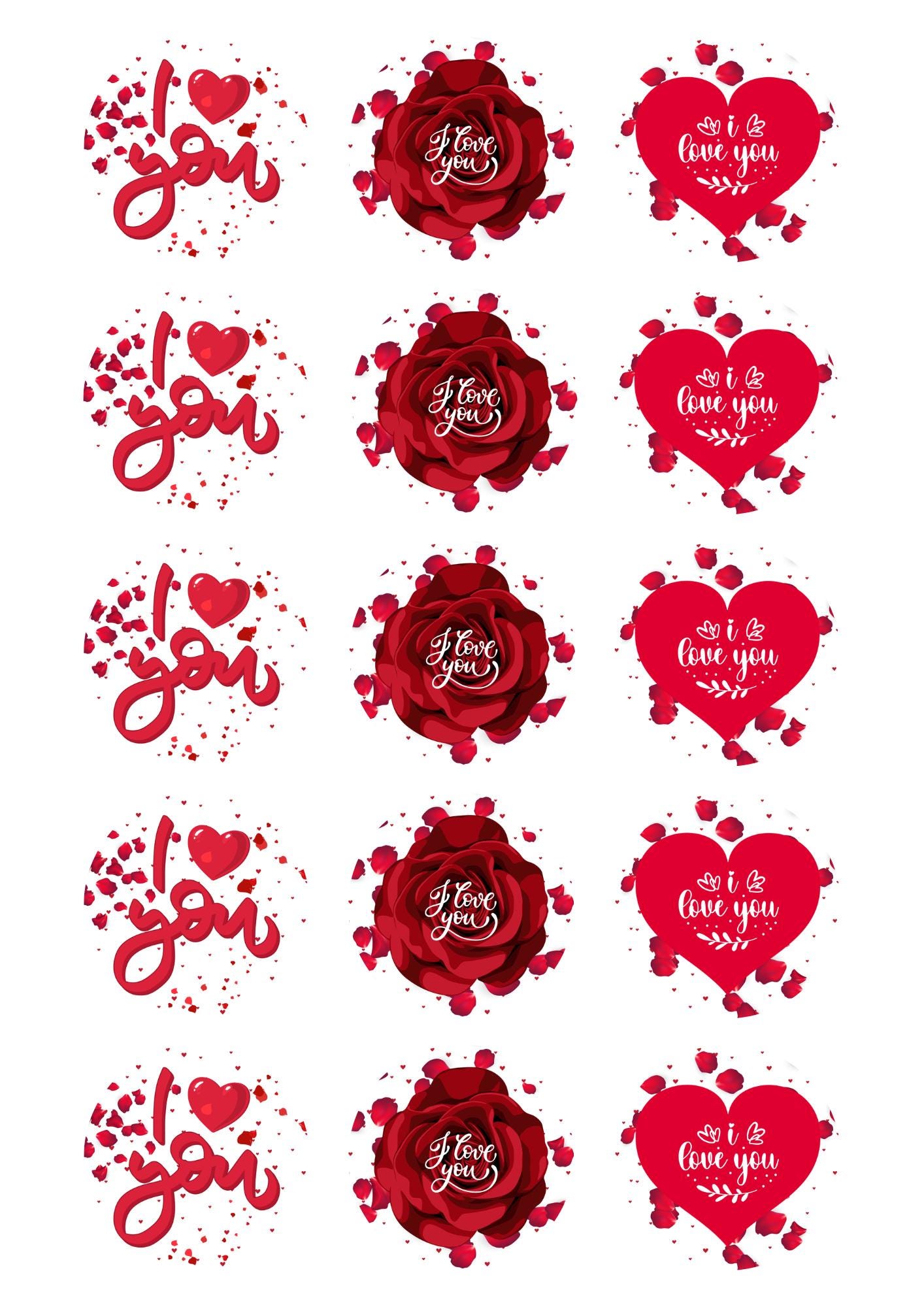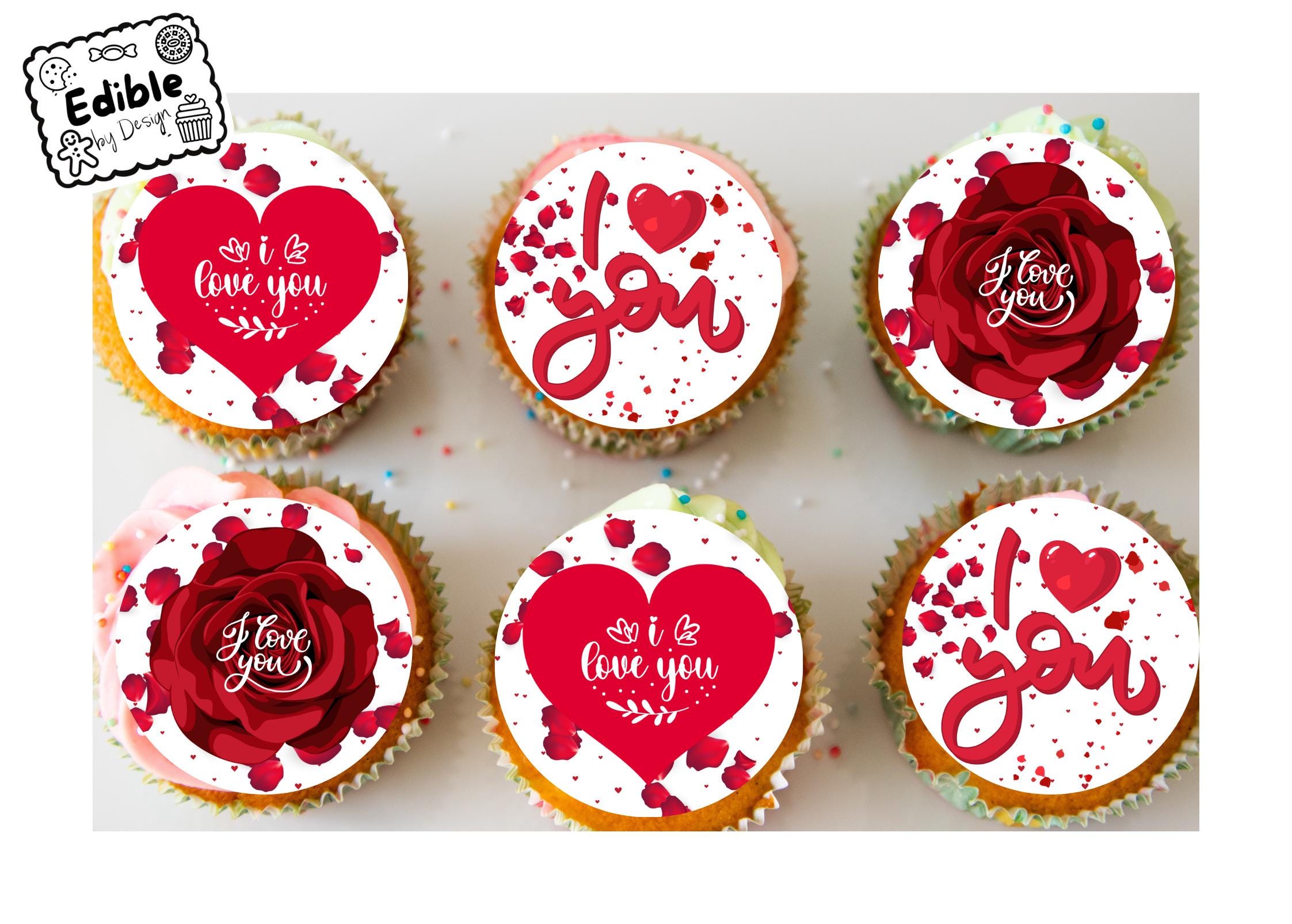 I Love You Valentines Red Rose Cupcake Toppers with edible ink.