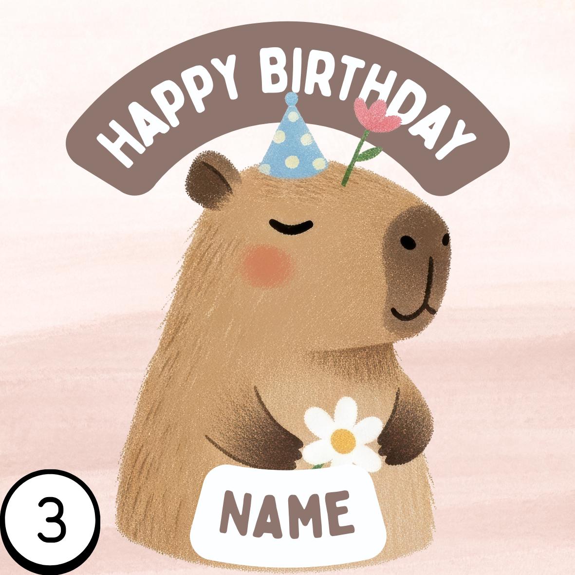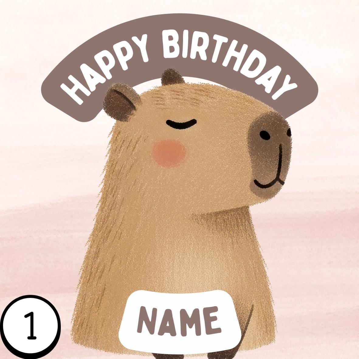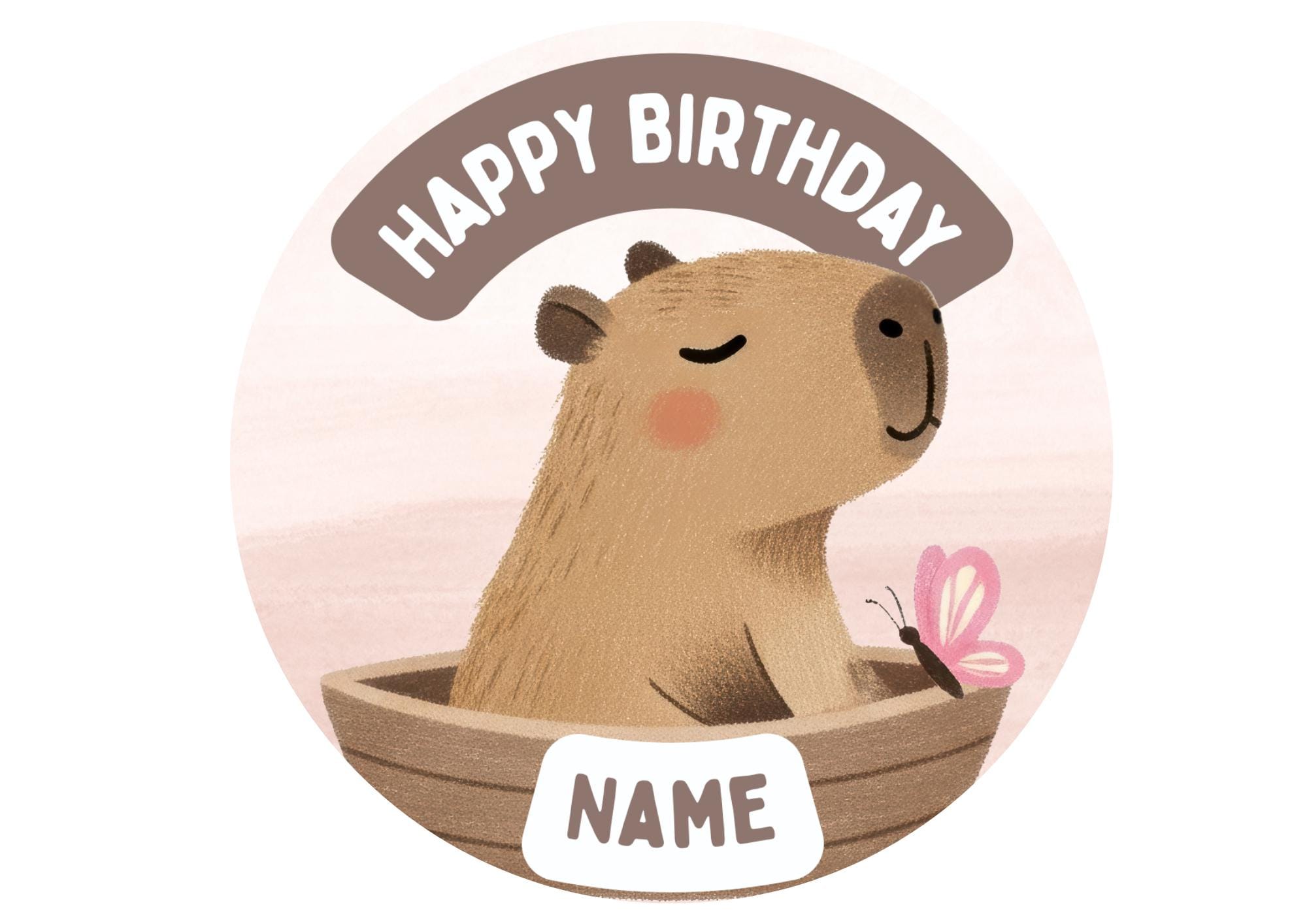 Cute Capybara Birthday Party Theme Large Round Cake Topper/s. Personalised with your choice of name and age.