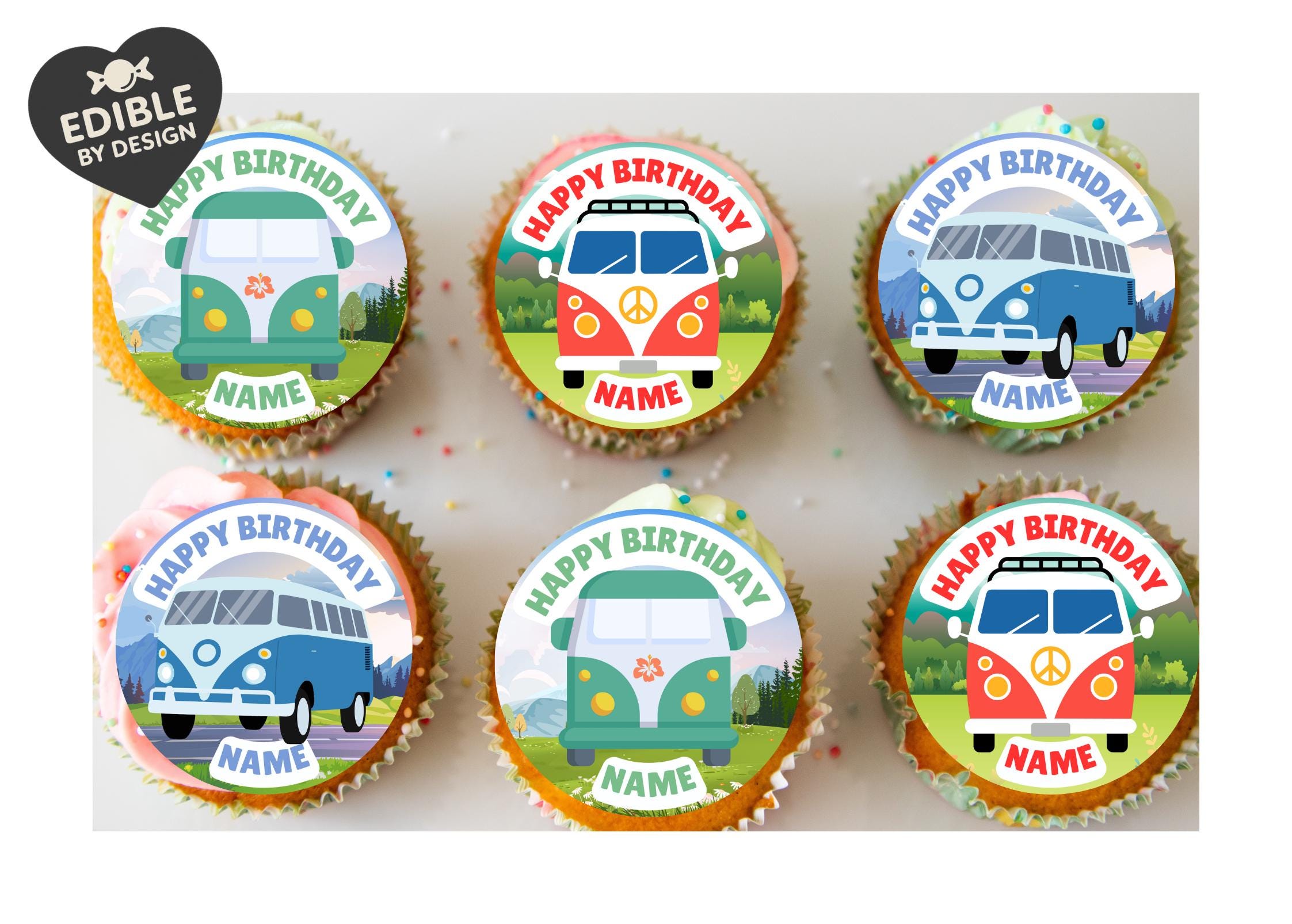 Retro Campervan Birthday Party Theme Cake Toppers. Personalised with your choice of name and age.