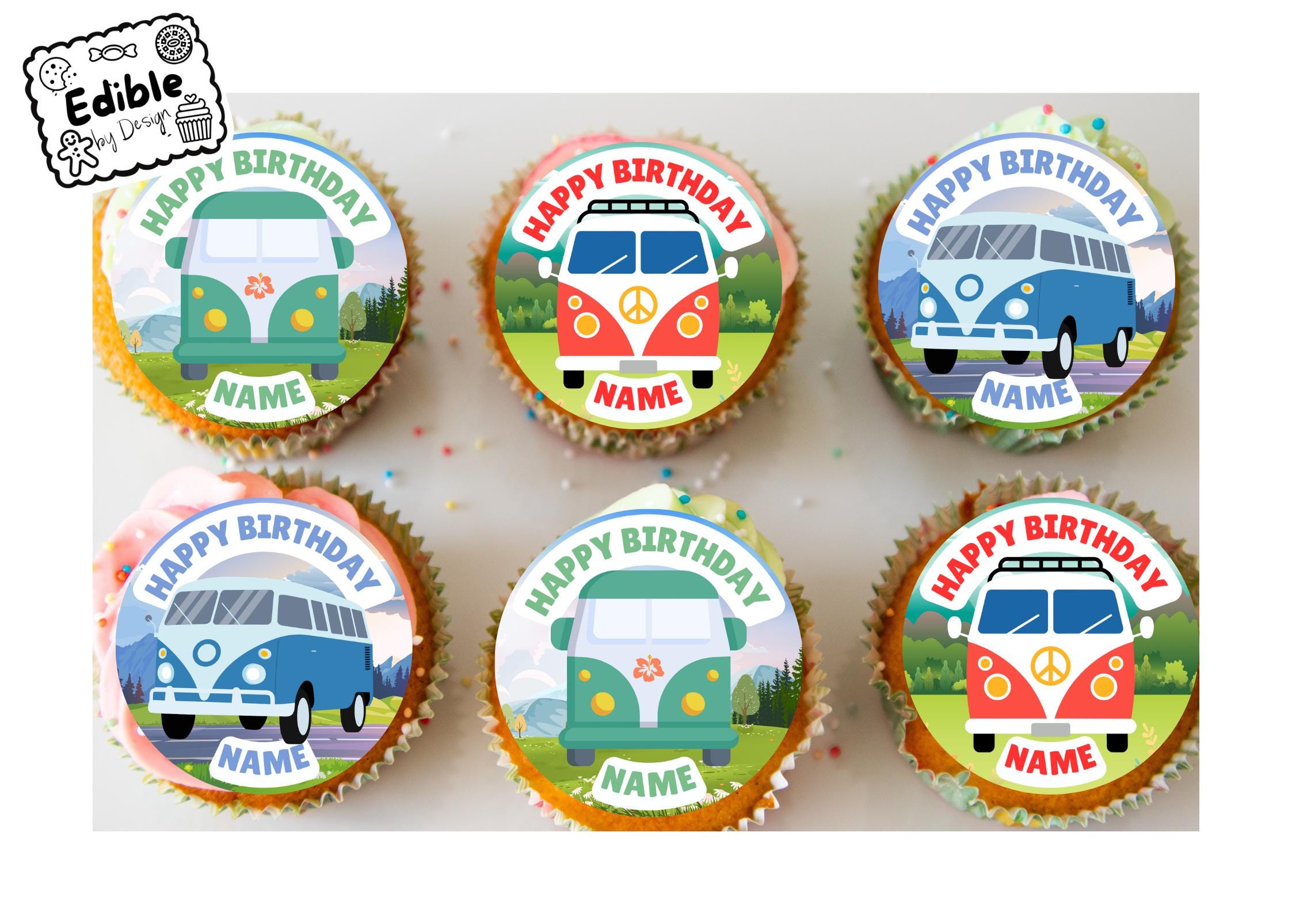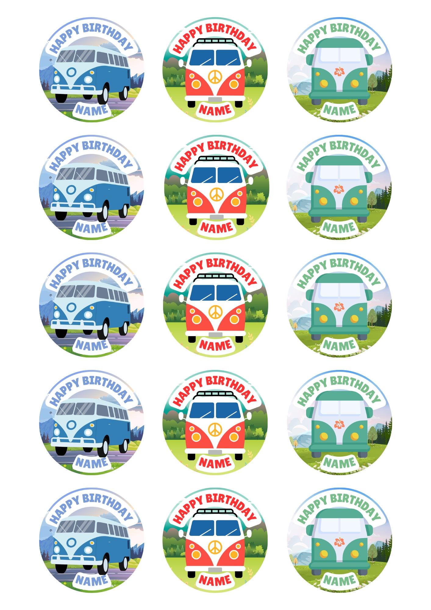 Retro Campervan Birthday Party Theme Cupcake Toppers. Personalised with your choice of name and age.
