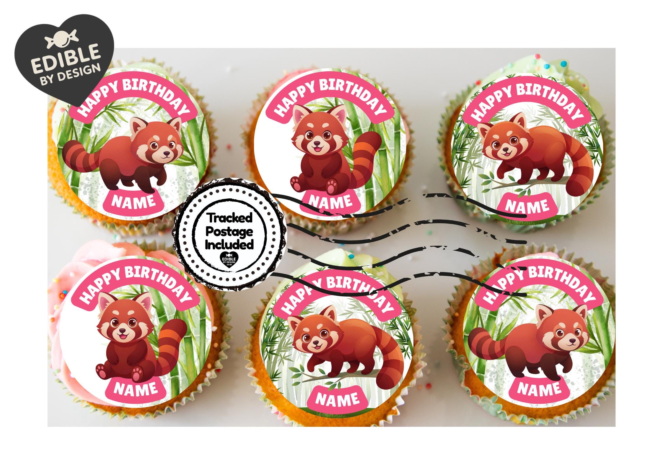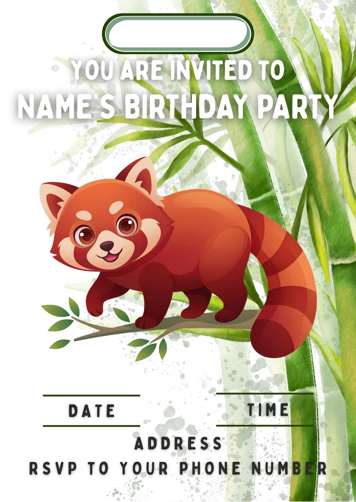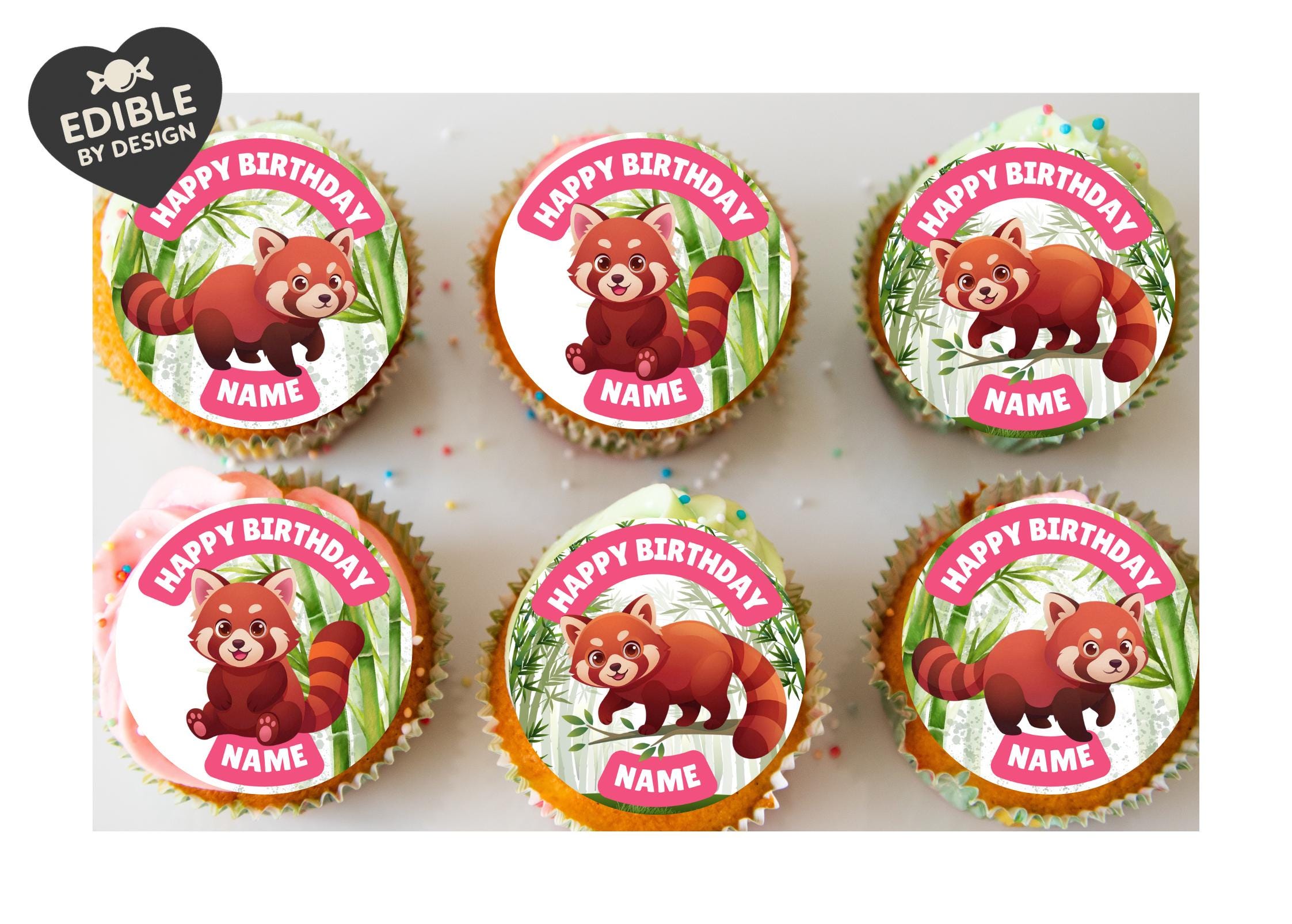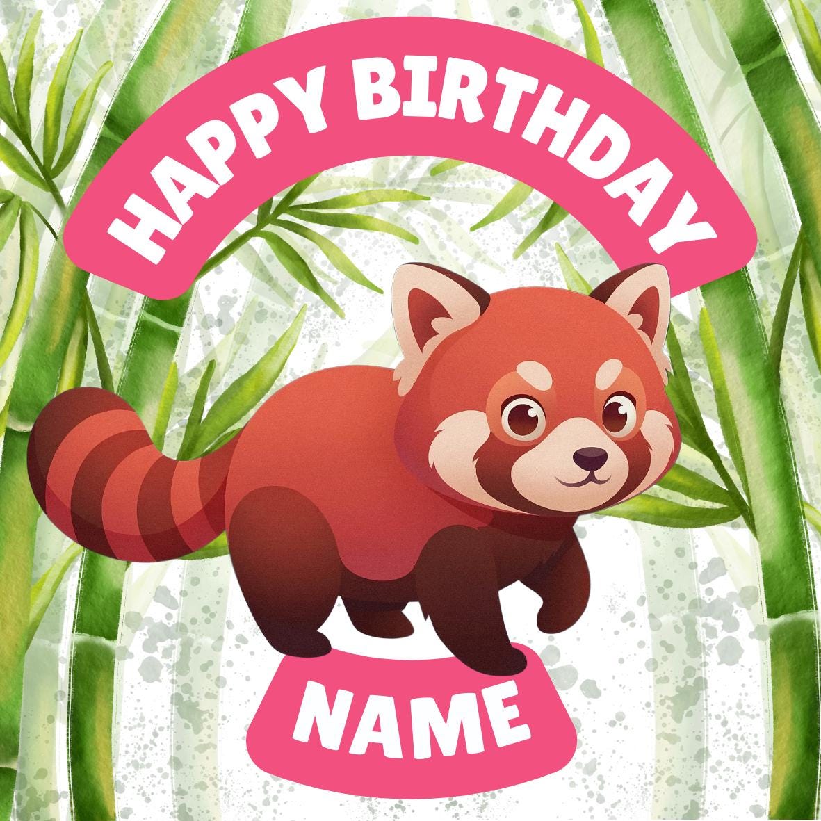 Red Panda Bamboo theme, personalised with your choice of name and age. Precut Personalised Cake Toppers with edible ink. Also available matching Invitations, Stickers, Foil Balloon and complete party pack.