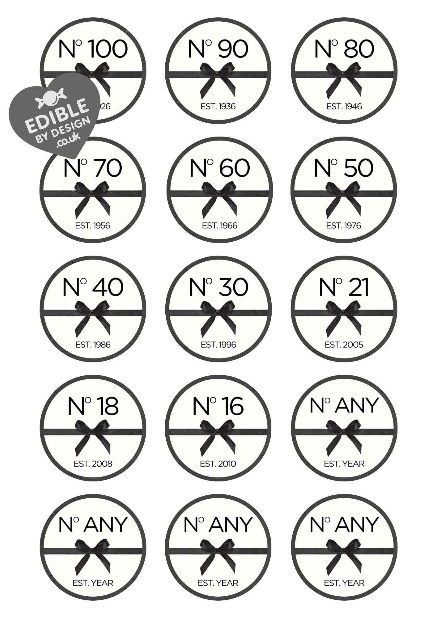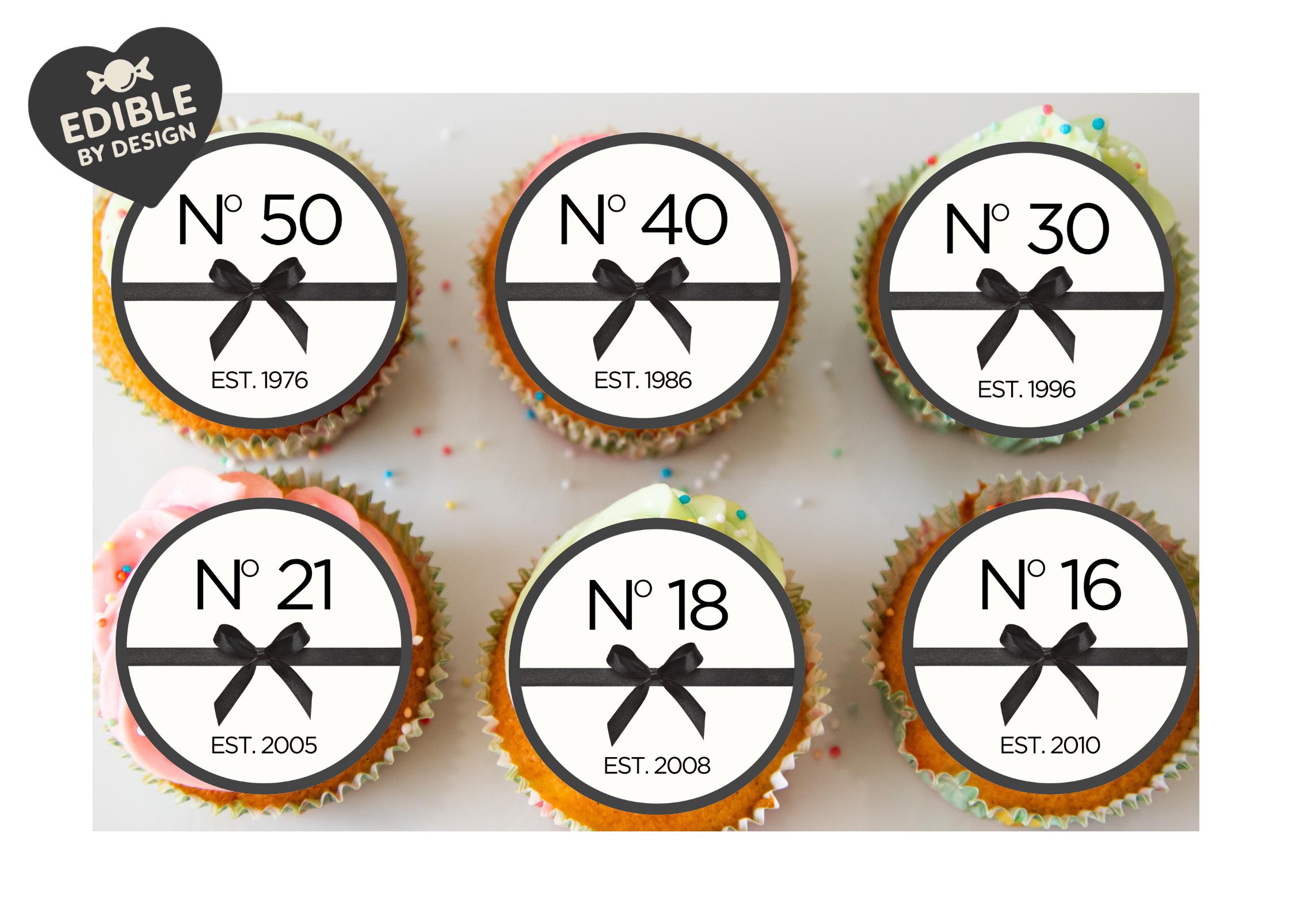 Precut Designer look Birthday Year Cake Toppers with edible ink. You choose est. year and age. Also available as Stickers - 15, Invitations, Foil Balloon and Party Pack containing all items.