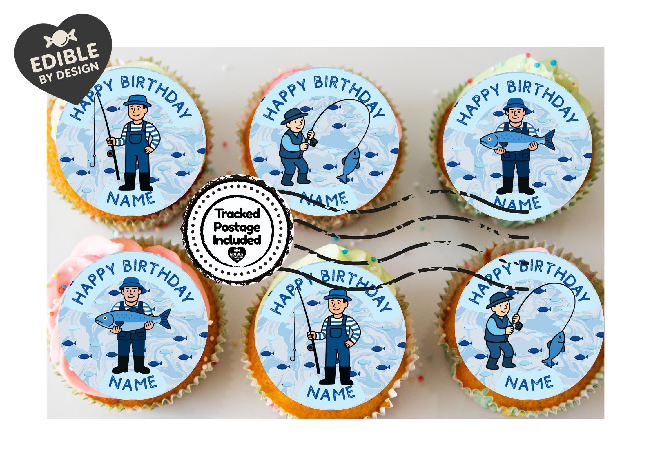 Precut Party Cake Toppers with edible ink. Fishing Angling theme Cake Toppers. These toppers are personalised with name and age as required. Also available as Stickers - 15 per sheet, Invitations - 16, 23" Foil Balloon and party pack containing all items. Choose from Icing Sheets, Vanilla Wafer Card, Wafer Card or Wafer Paper -