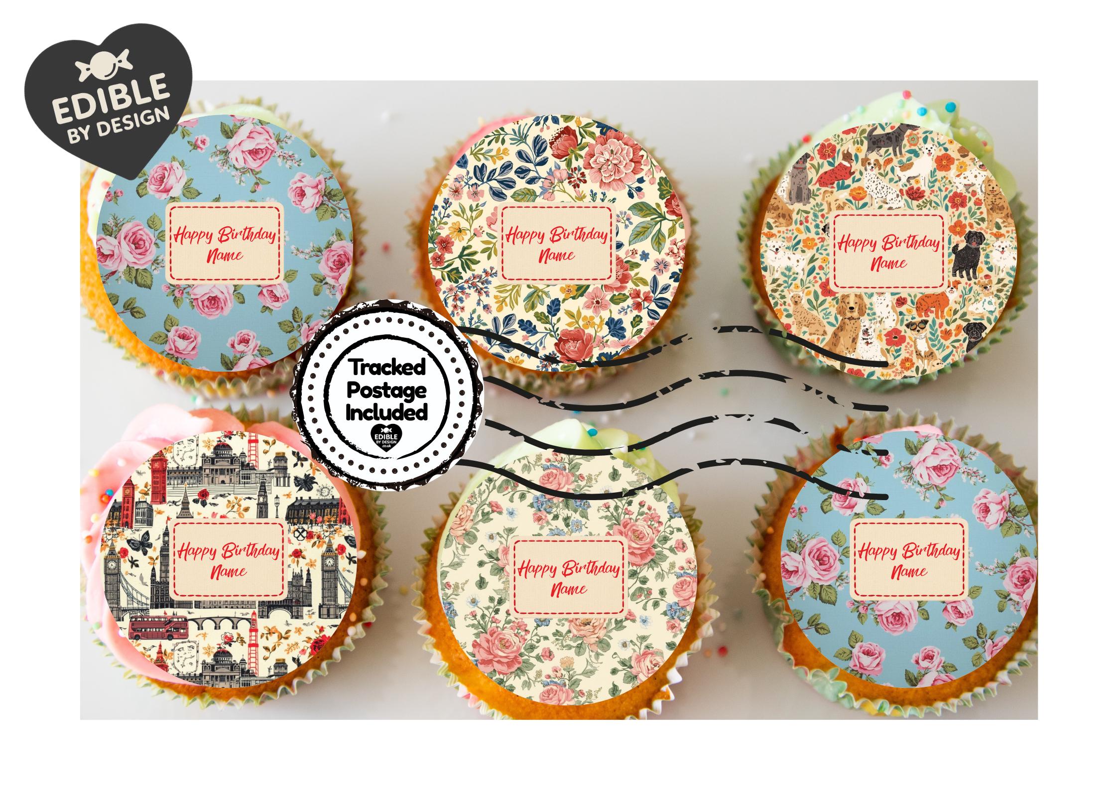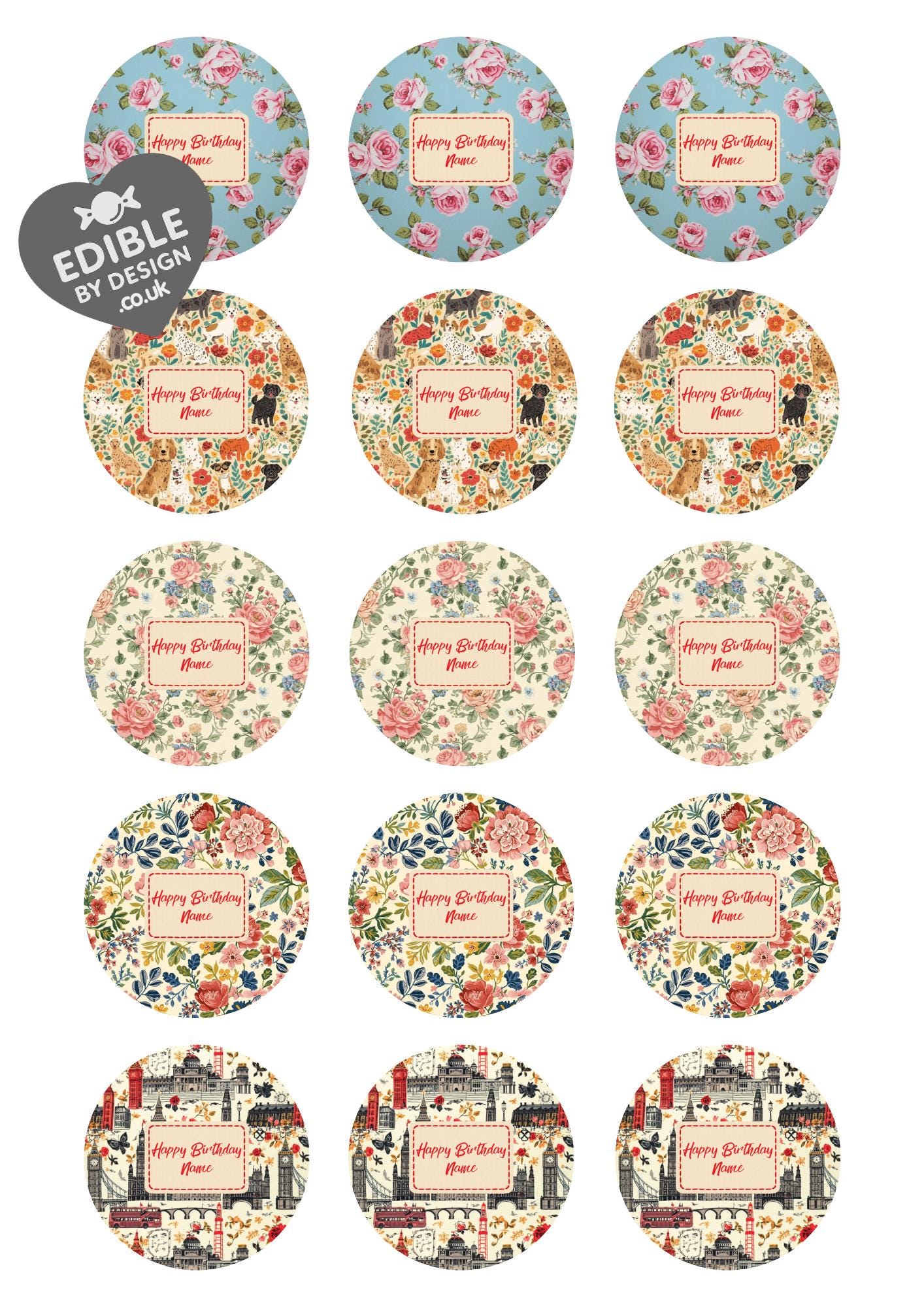 Precut Birthday Cake Toppers with edible ink. Designed inspired by Cath Kidston. Also available as Stickers, Invitations, 23" Foil Balloon and a Party Pack containing all items.