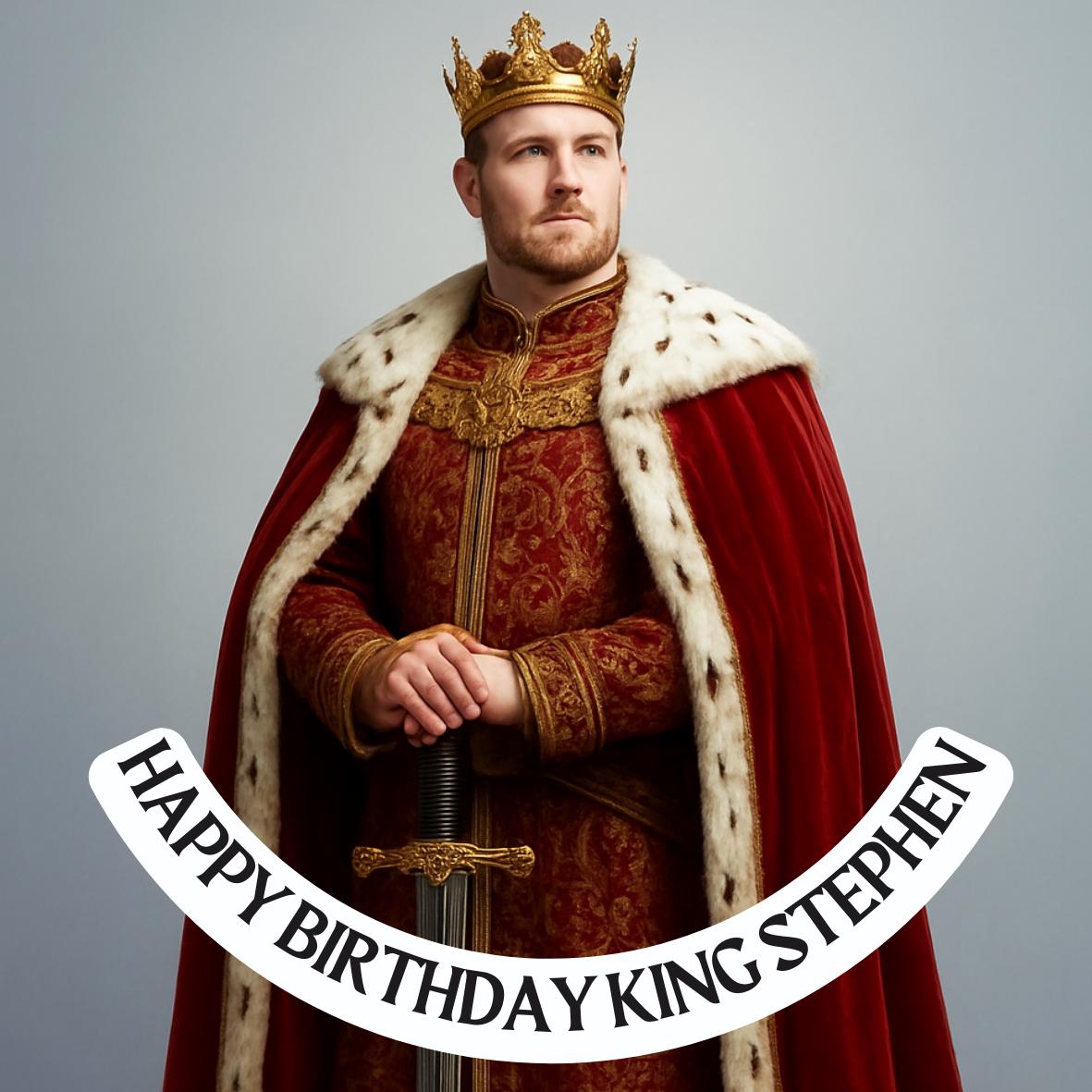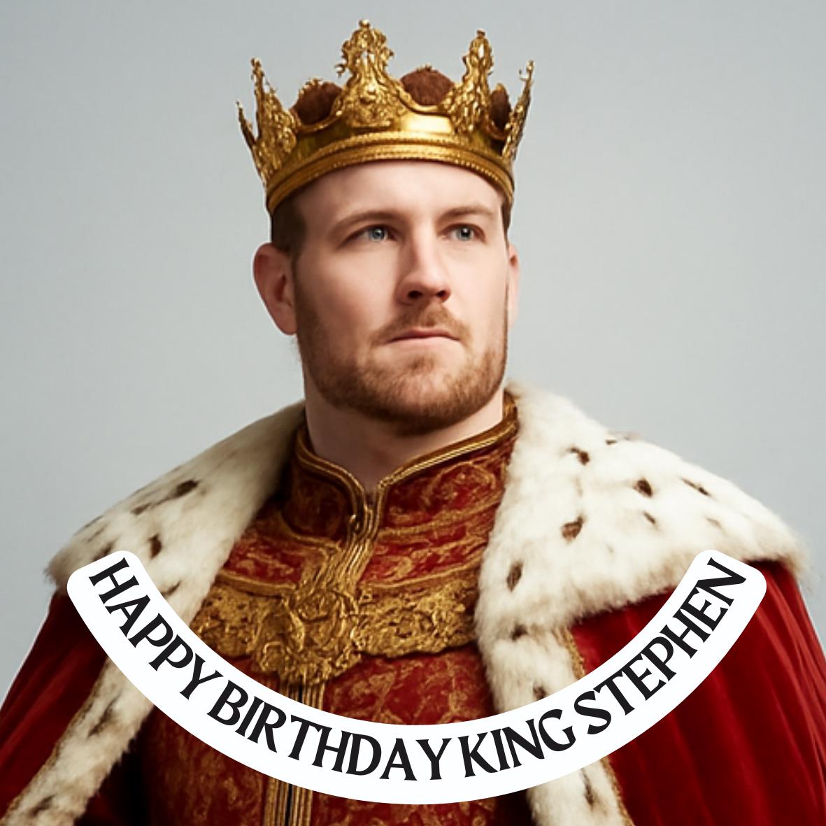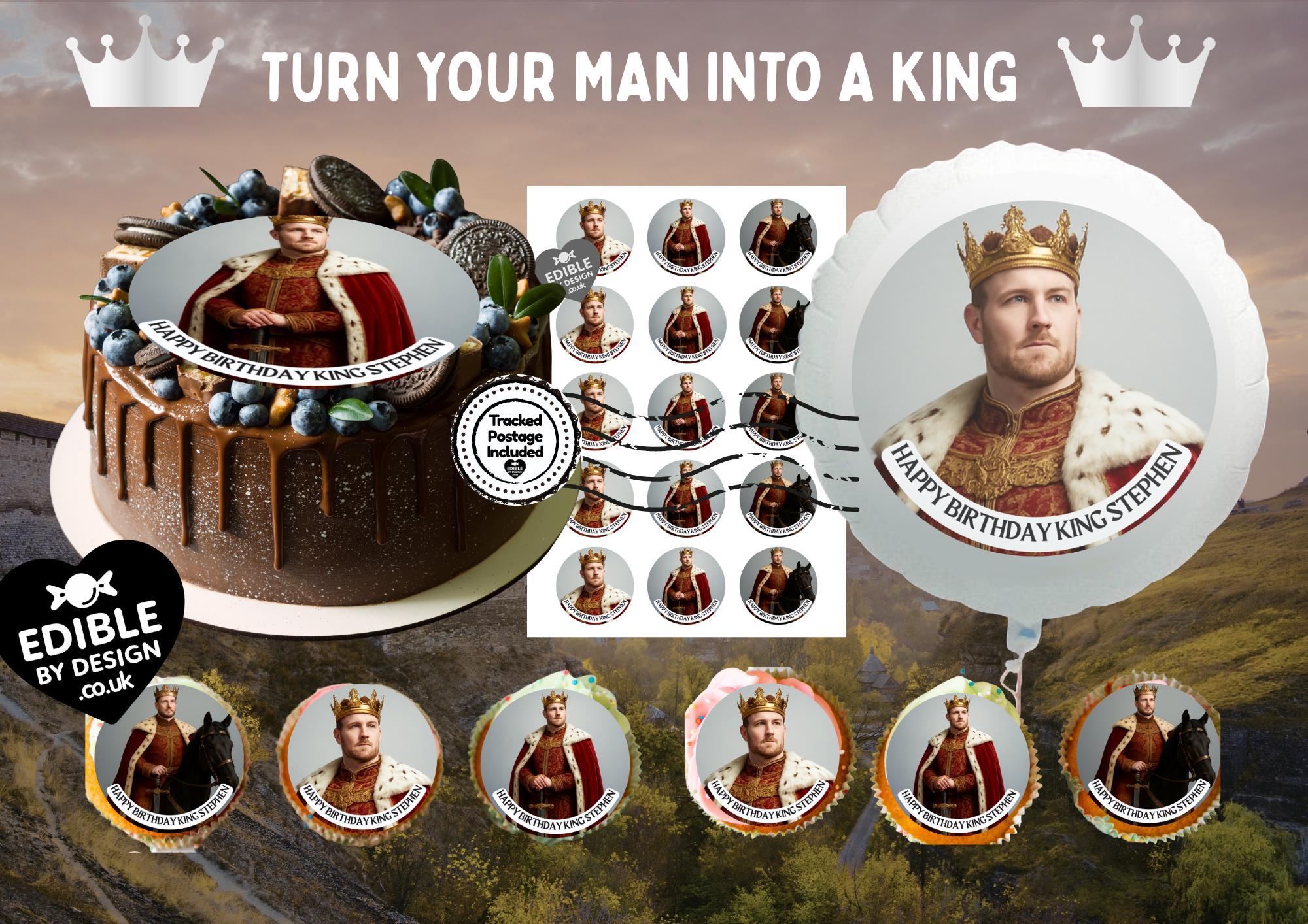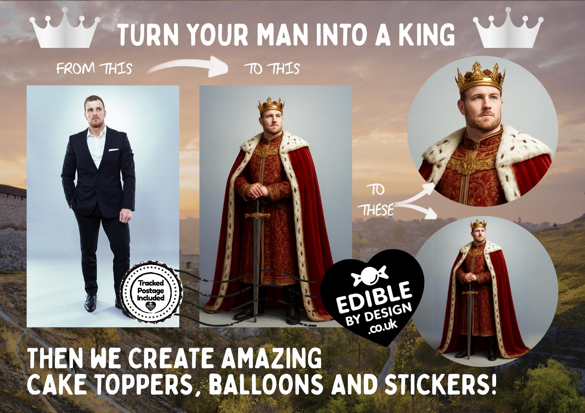 Photo Transformation Man to King Cake Toppers. Personalised with your photo transformed into an King, name and age. Send your photo via message to the seller.