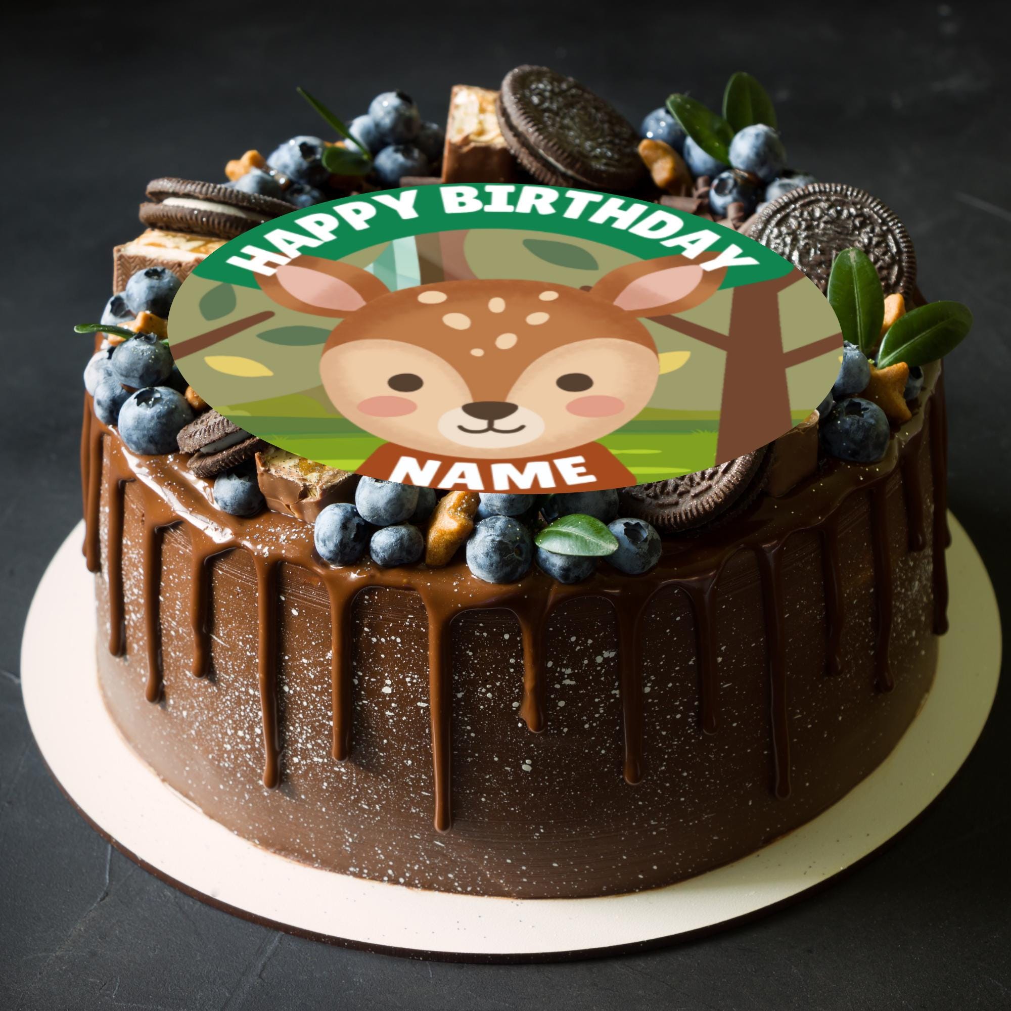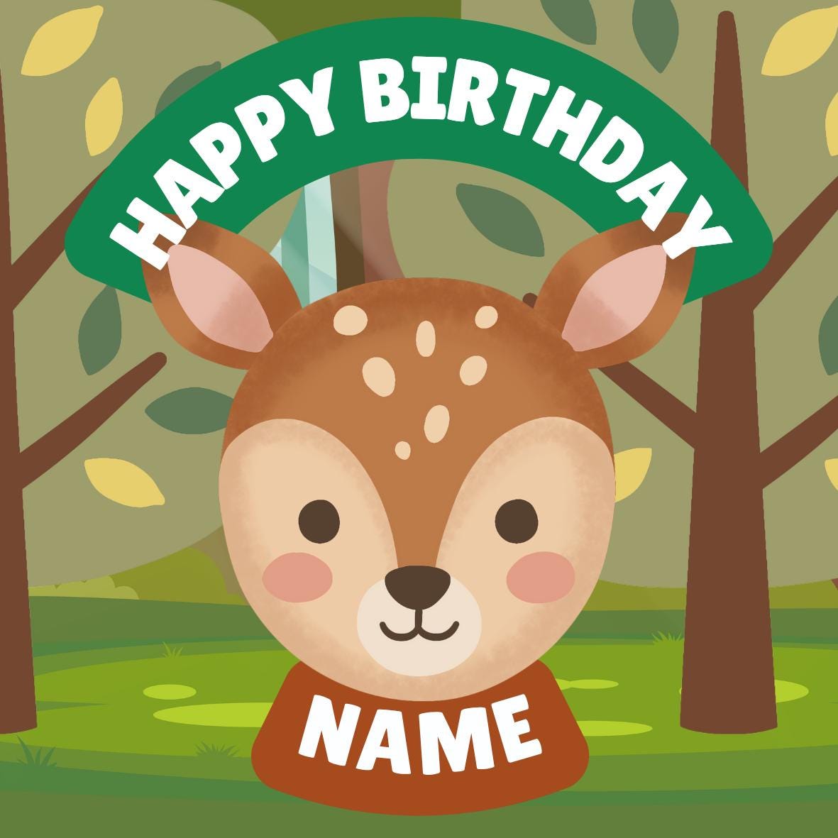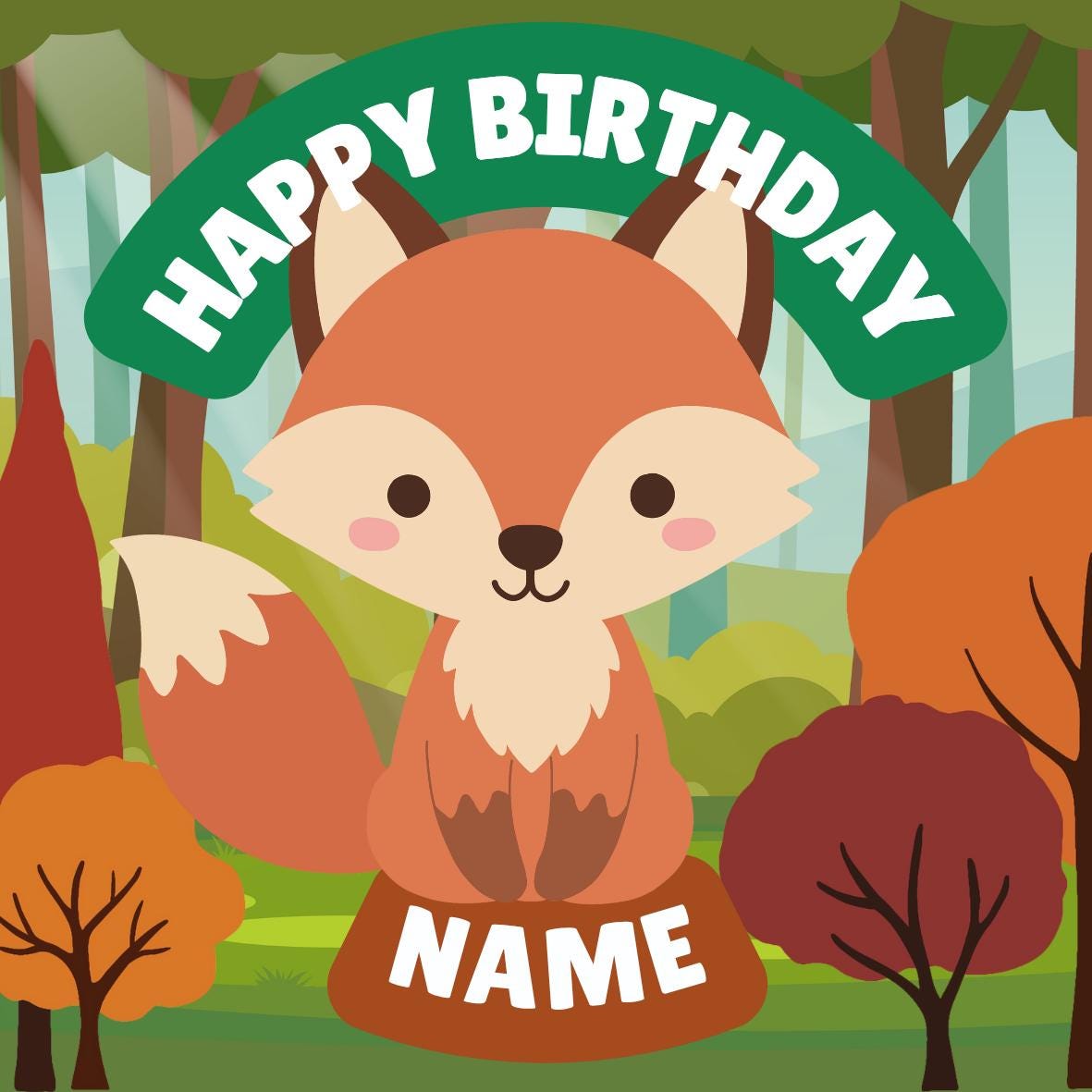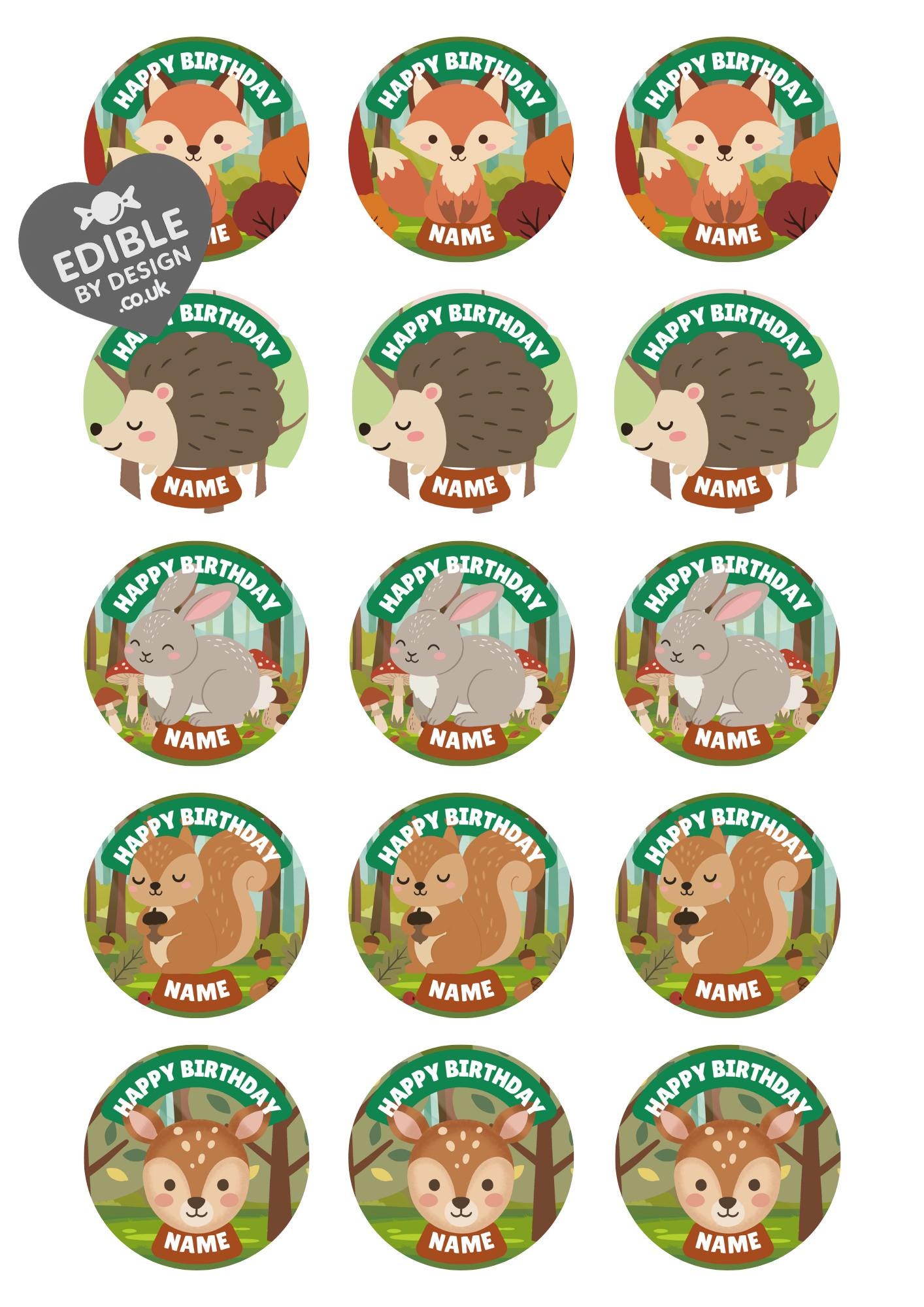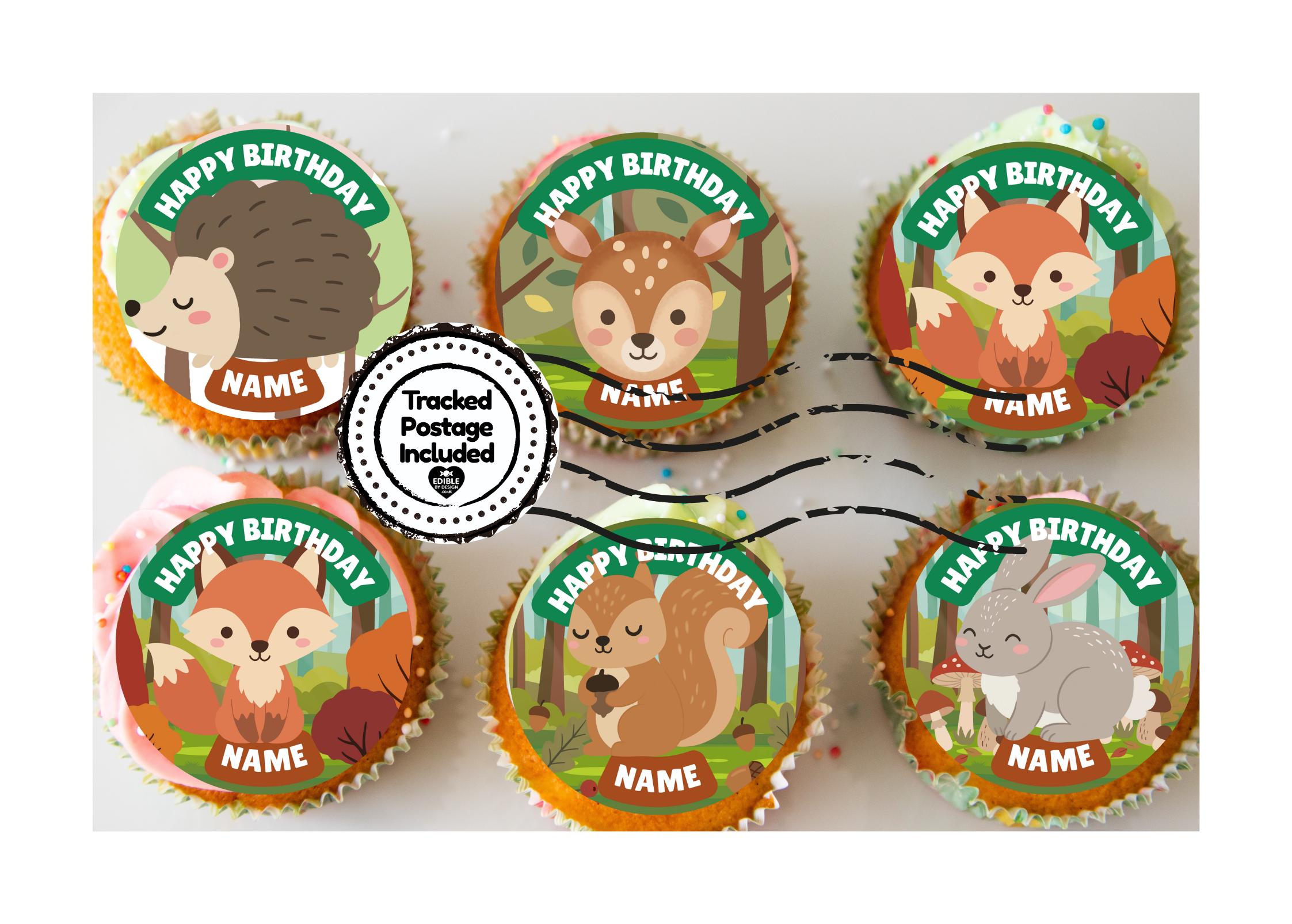 Cute Forest Animal Theme Cupcake Toppers. Personalised with your choice of name and age. Features Rabbit, Fox, Deer, Squirrel and Hedgehog.