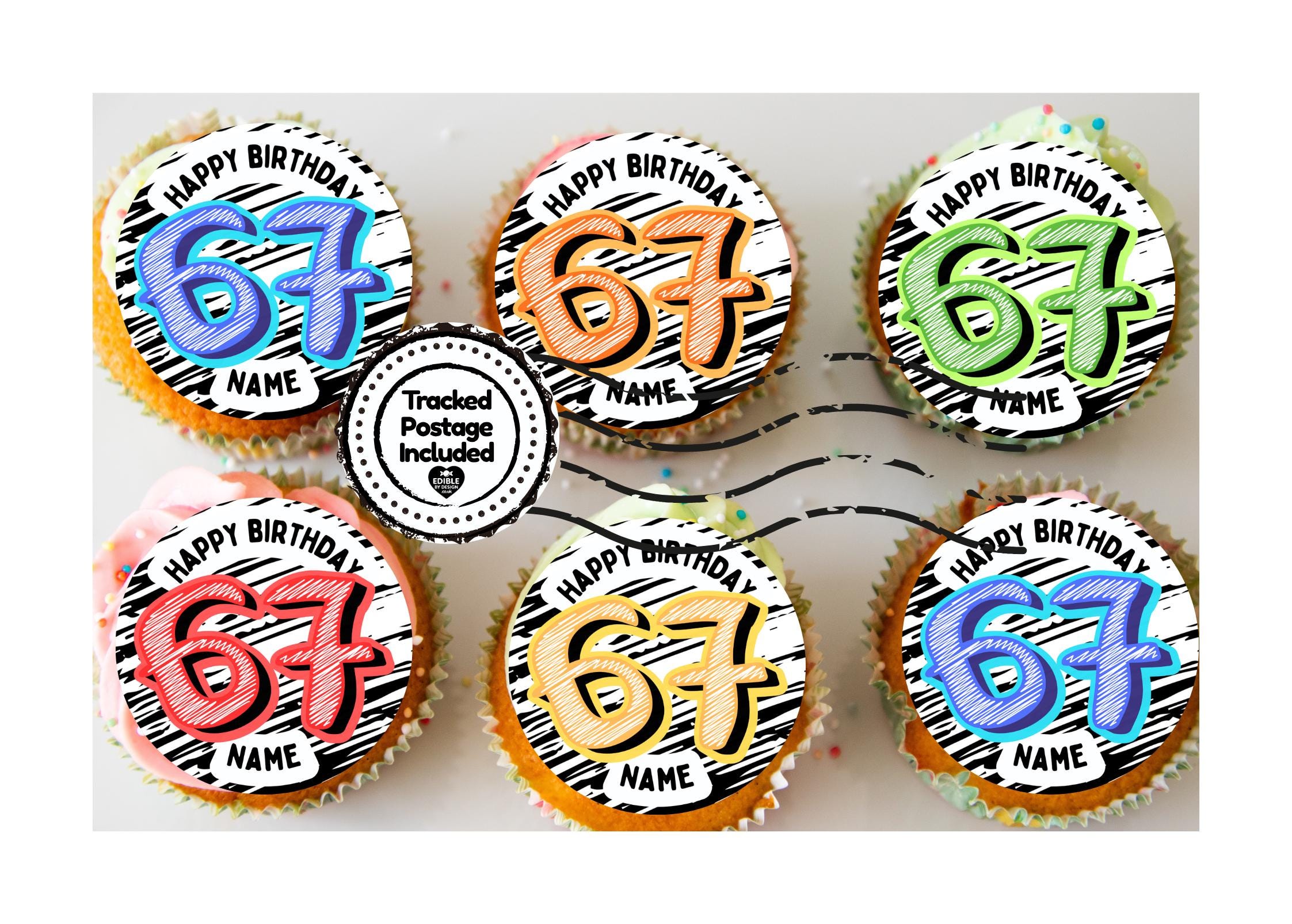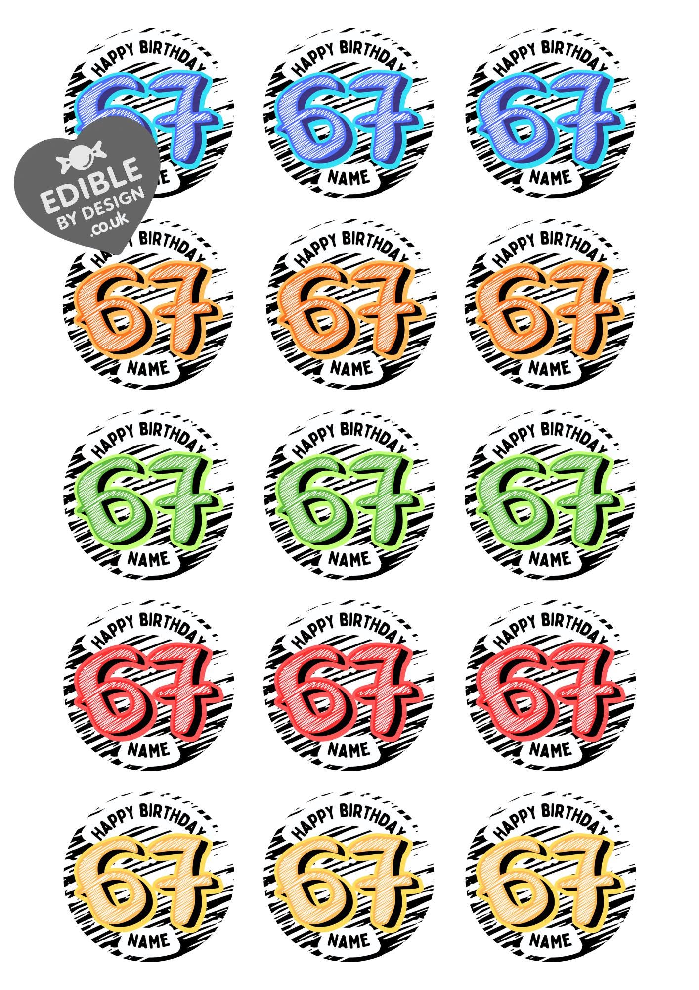 67 Theme Cupcake Toppers. Personalised with your choice of name and age.