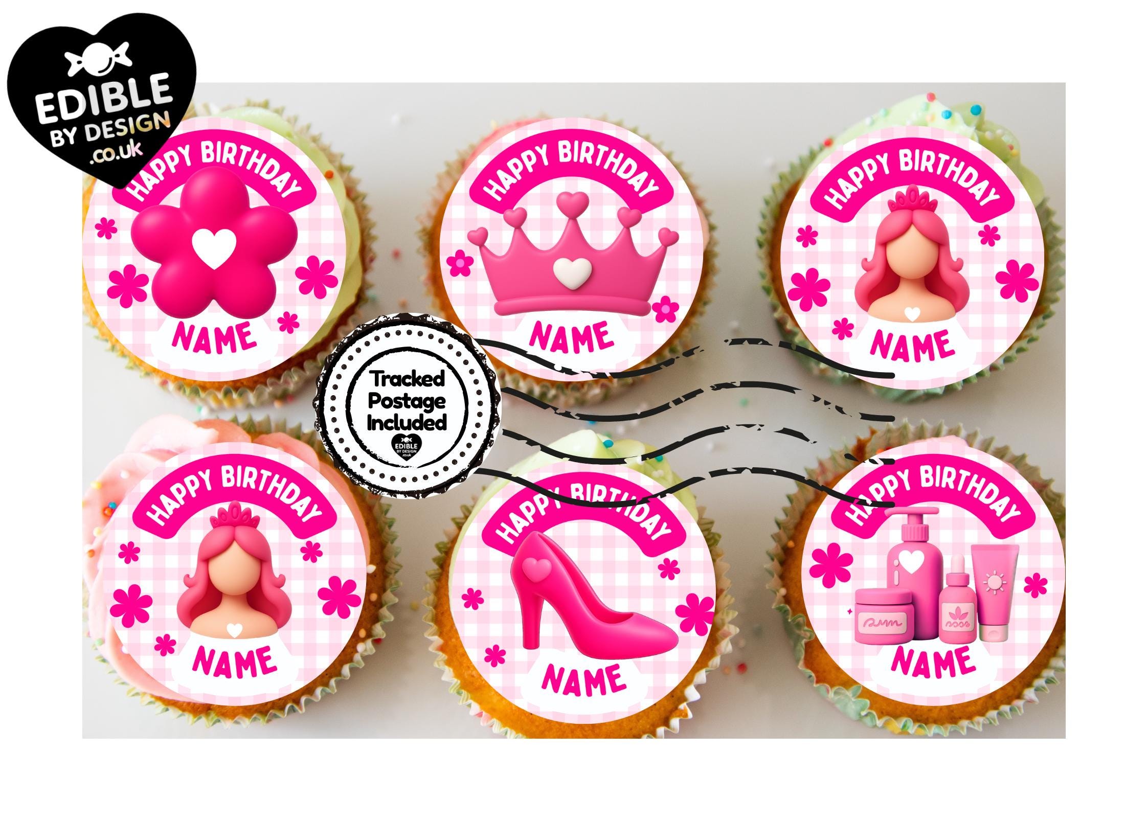 Pink Girl Theme Cupcake Toppers. Personalised with your choice of name and age.