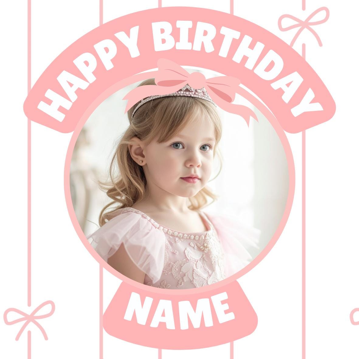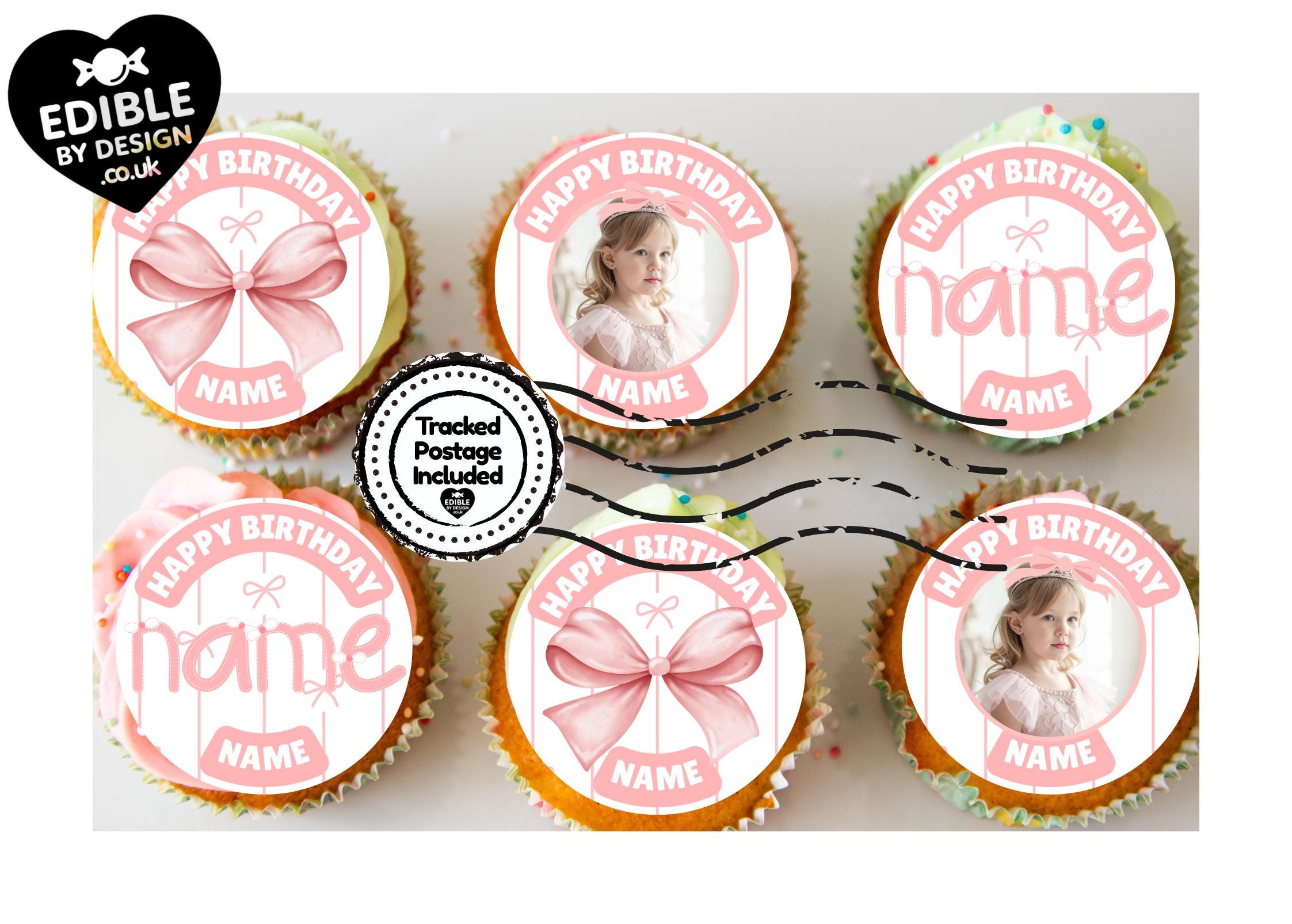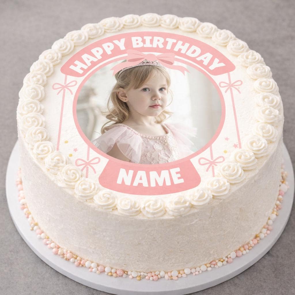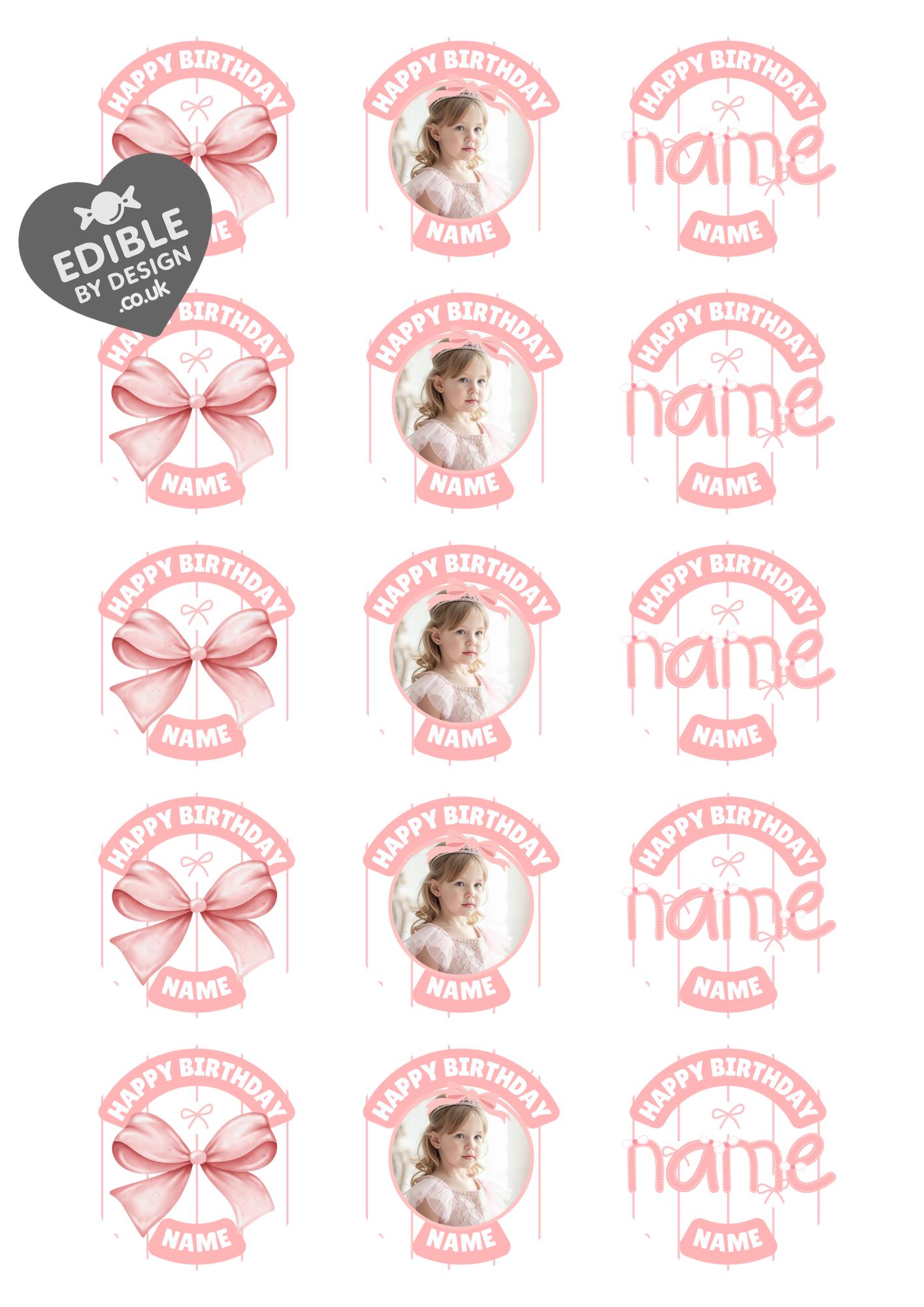 Precut Cake Toppers with edible ink. Pink Bow Photo theme Cake Toppers. These toppers are personalised with the name, photo and age of your choice. Also available matching Invitations, Stickers, Foil Balloon and complete party pack.