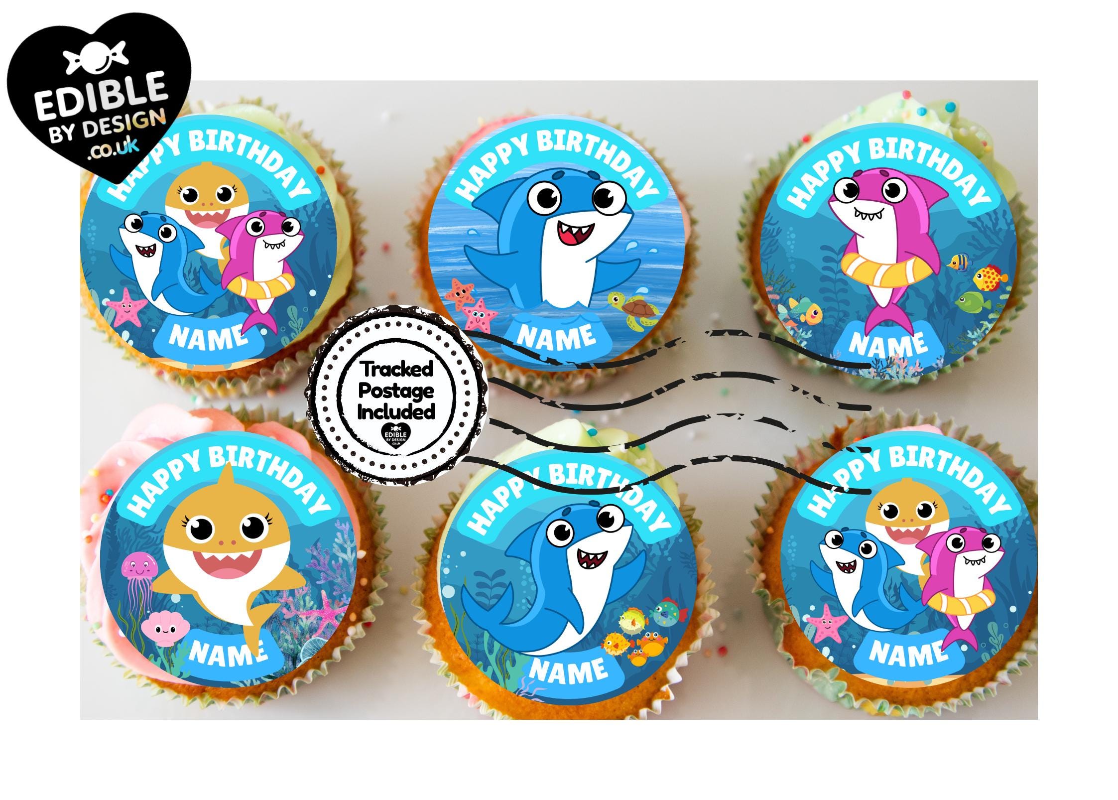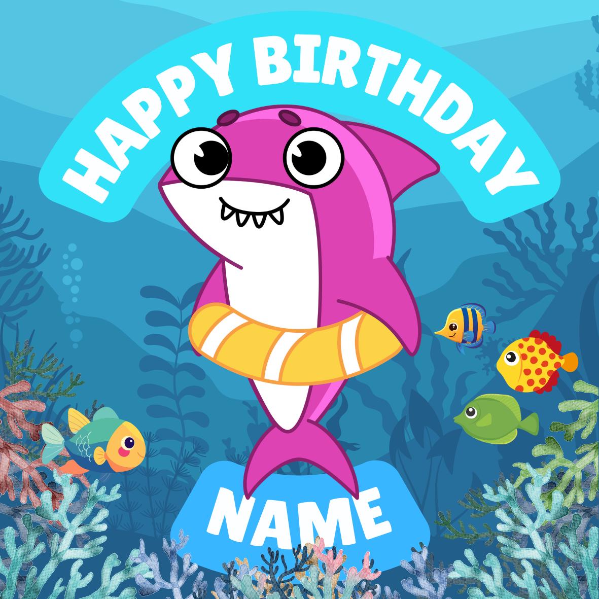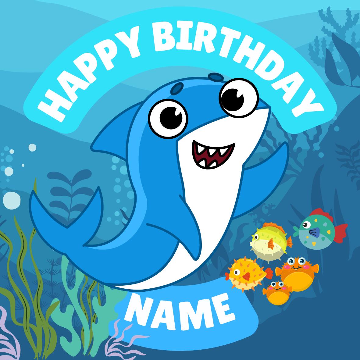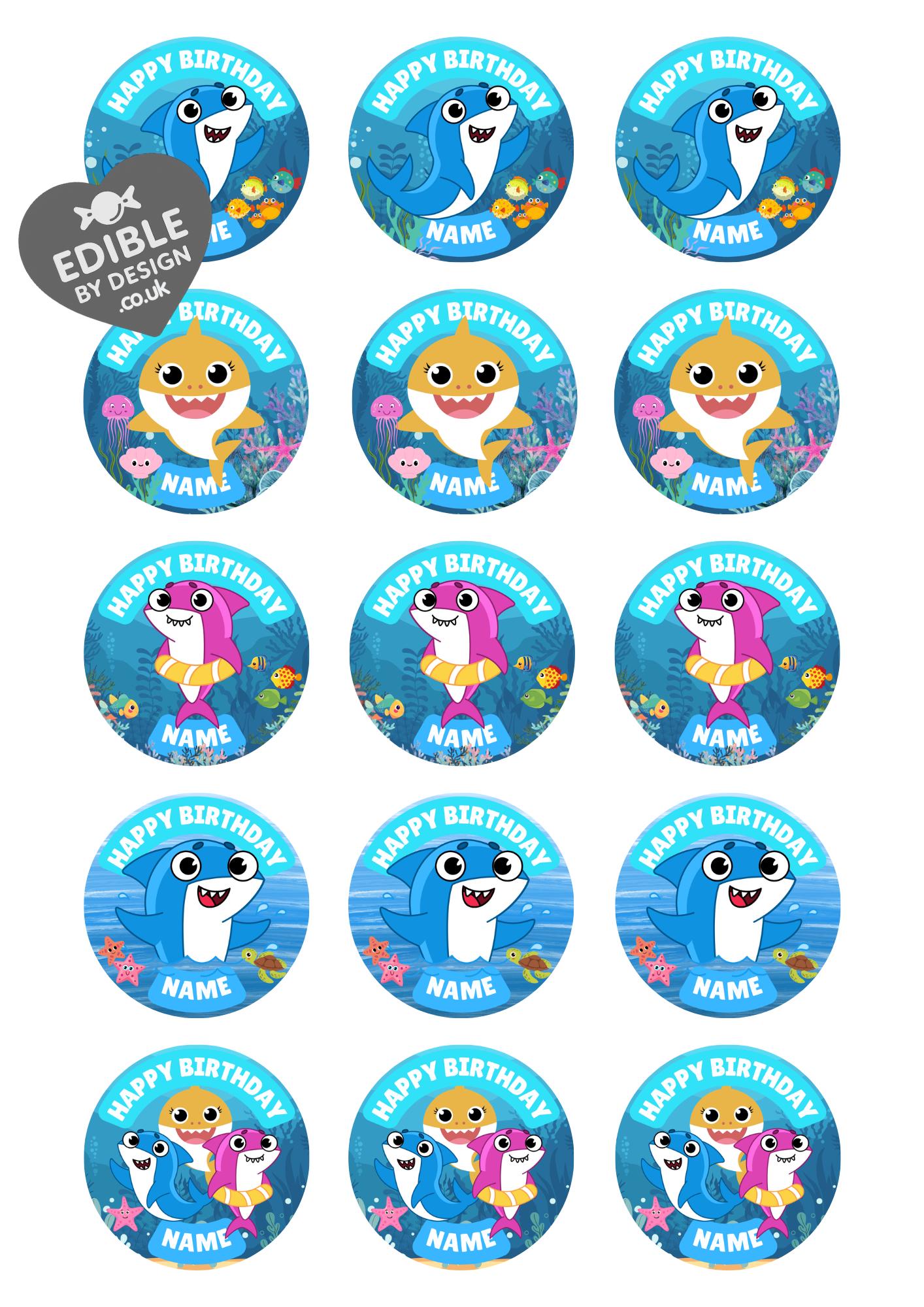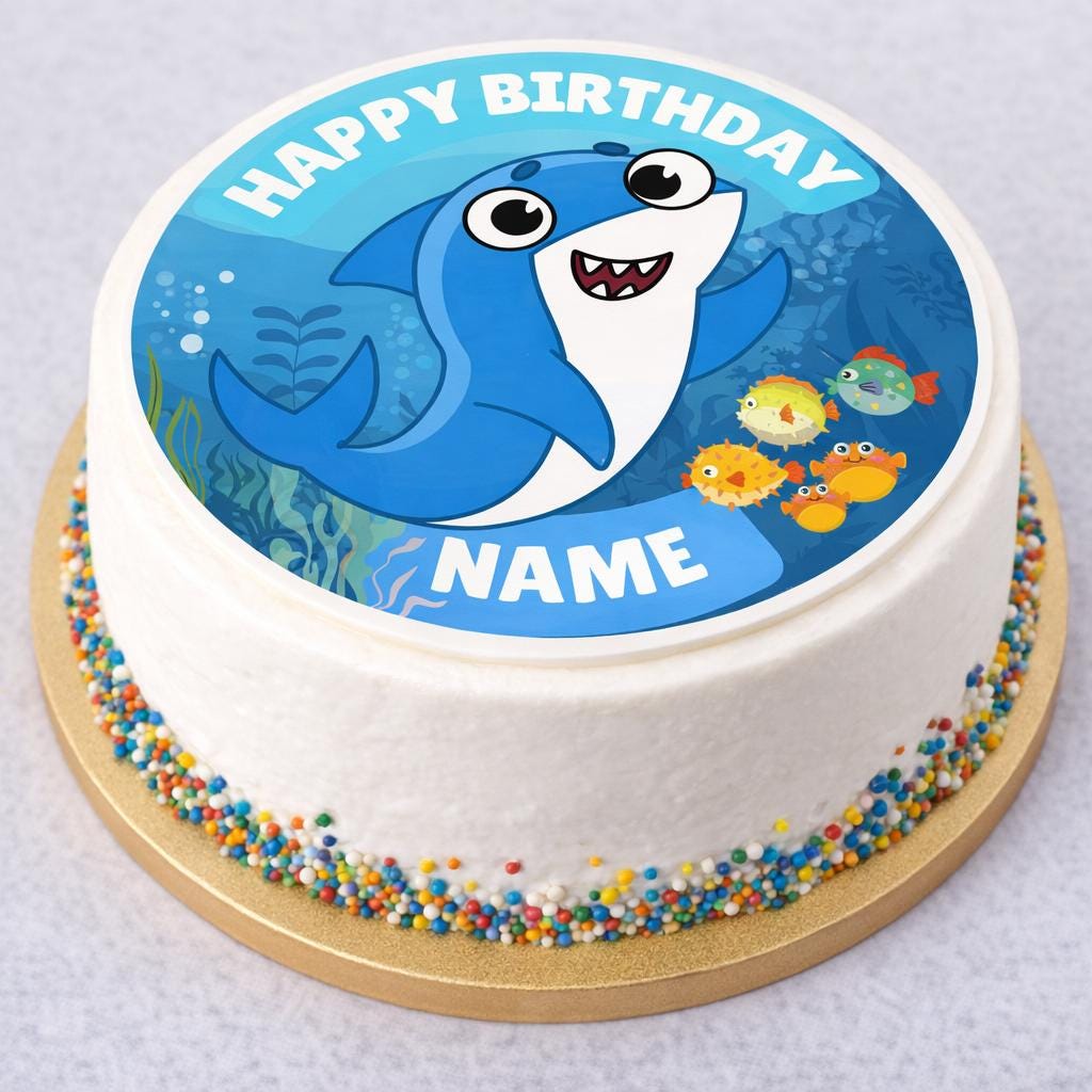 Cute Baby Shark Theme Cake Toppers. Features your choice of age and name.