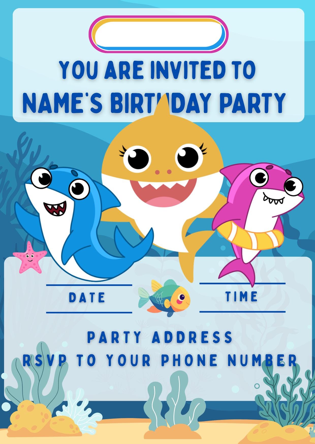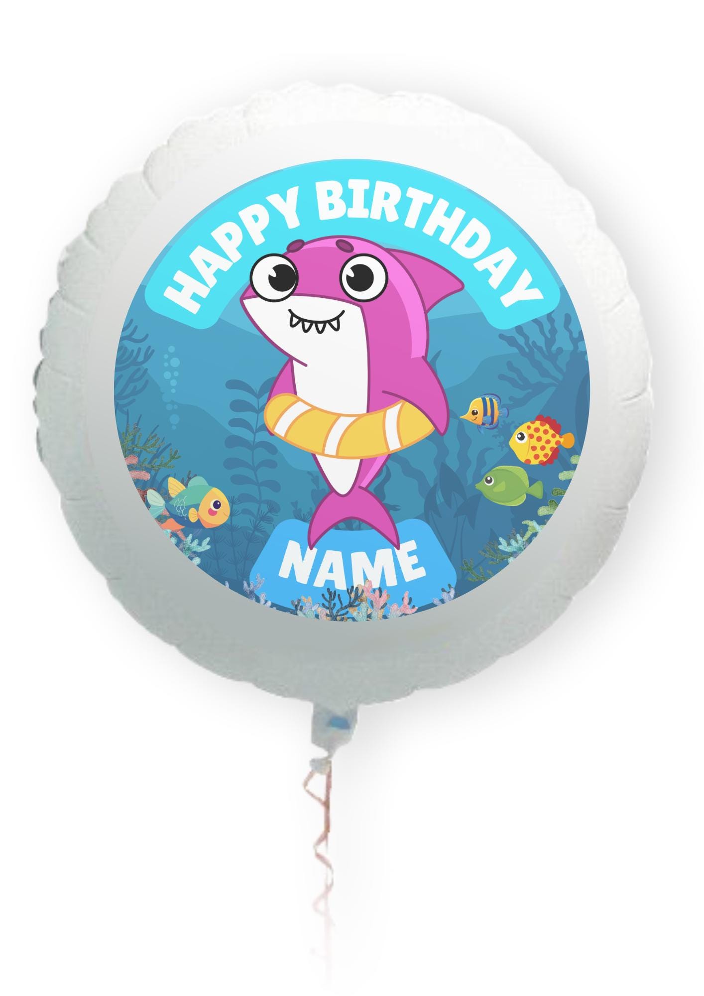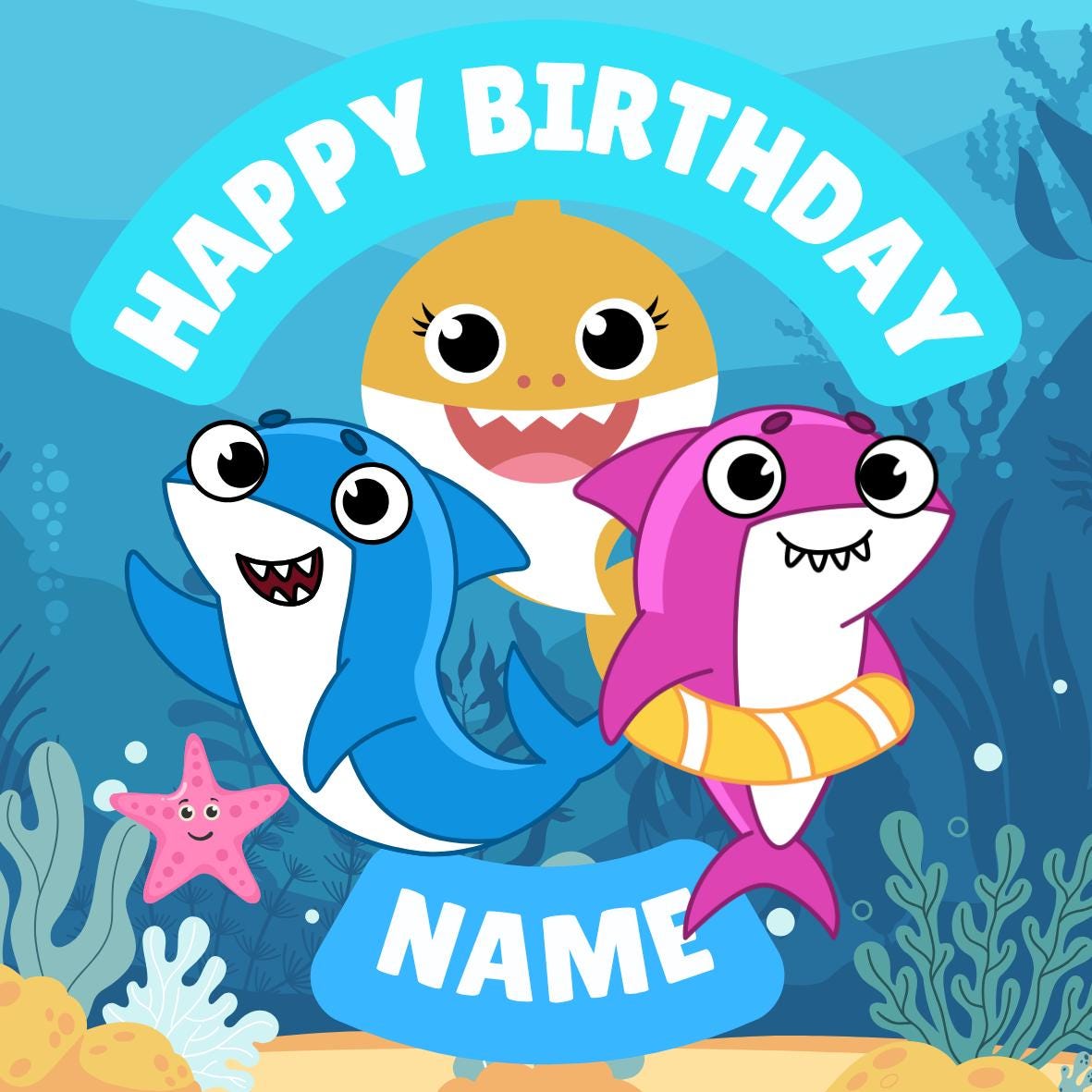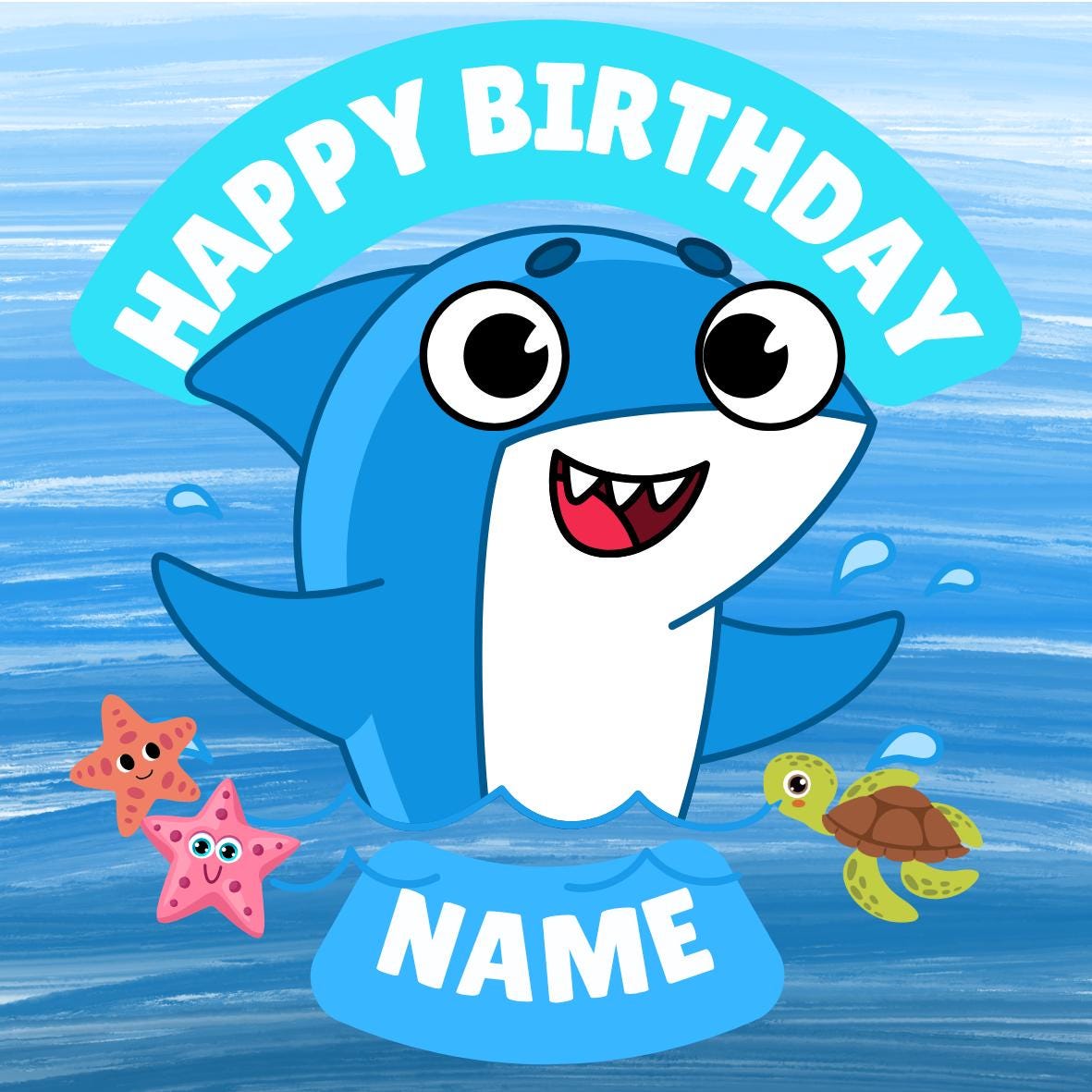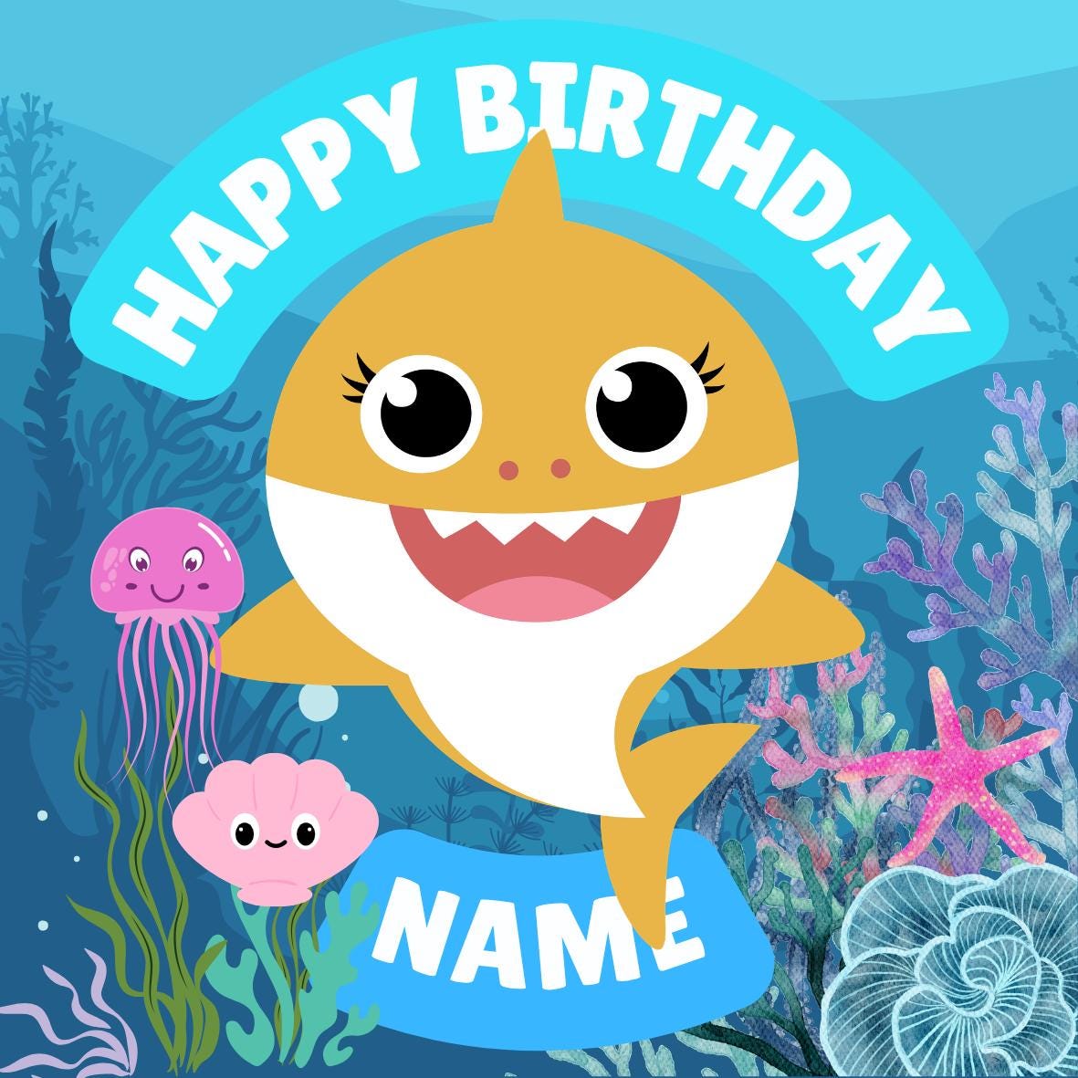 Cute Baby Shark Theme Cake Toppers. Features your choice of age and name.